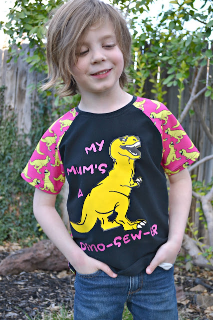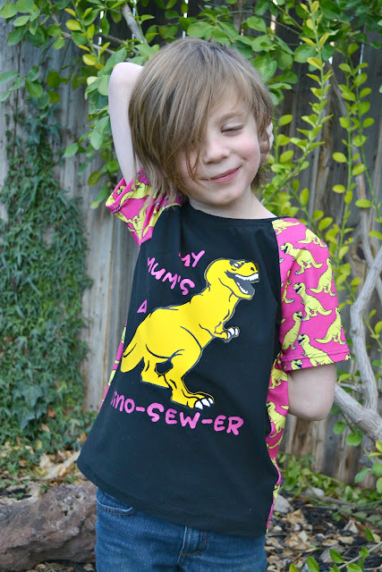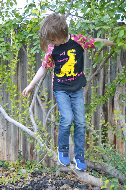 My motto with my kids has been, "if you like it, we can make it!" and Jude tends to have quite a lot of pink/purple/floral designs in his wardrobe. I've been holding onto this Dinosaur print from TKB Prints for a while now and it was one Jude chose for this series. He chose a few other prints, but due to life going crazy, it's the only one I got finished in time. LOL