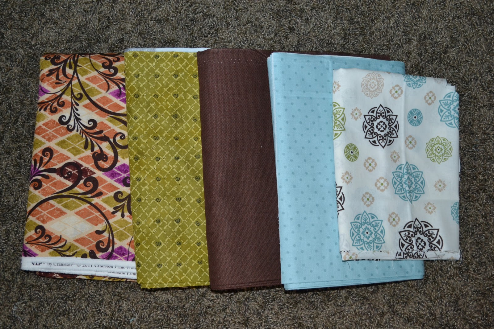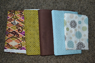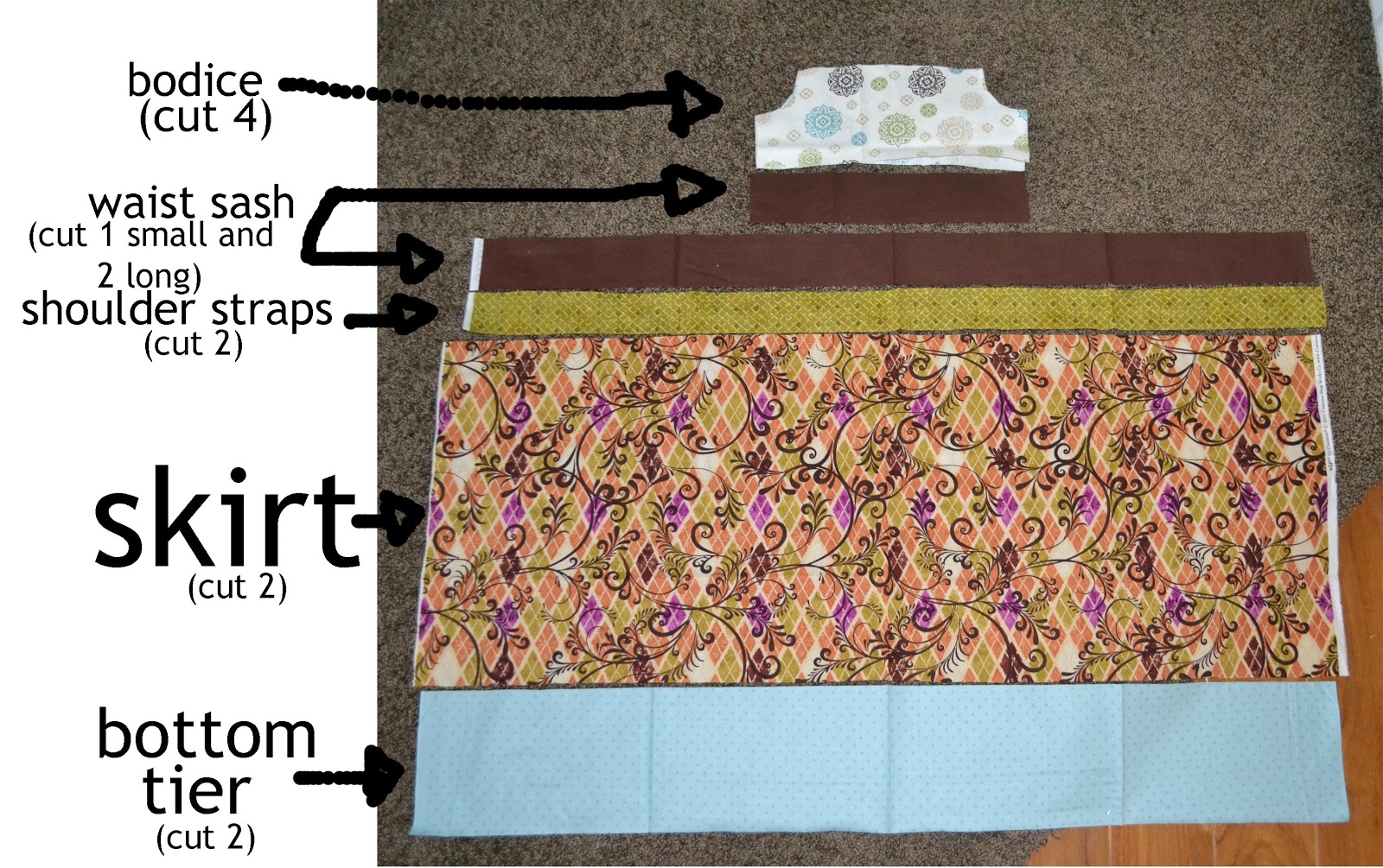 So how do we make this cute and adorable dress? For the one I'm making I chose 5 different fabrics. You will need a total of 2 1/2 yards of fabric and 2 spools of ribbon (about 3 yards) for a size 8.