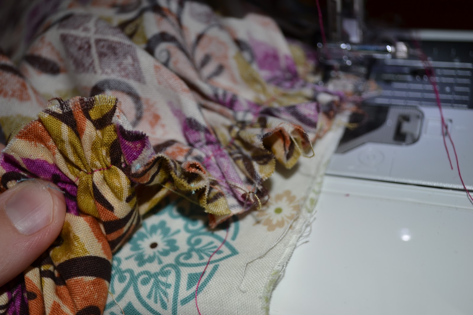 Now using your longest stitch, go around the top of the skirt so you can ruffle it up and sew it onto the bodice. I usually line up both side seams of the skirt with the side seams of the bodice and pin them there, then ruffle it up. Make sure you do right sides together though.
