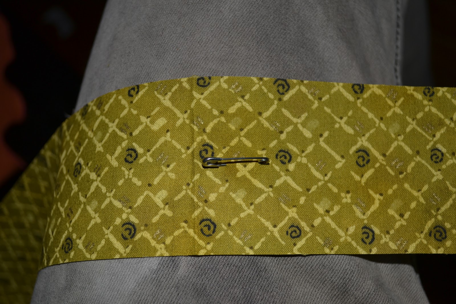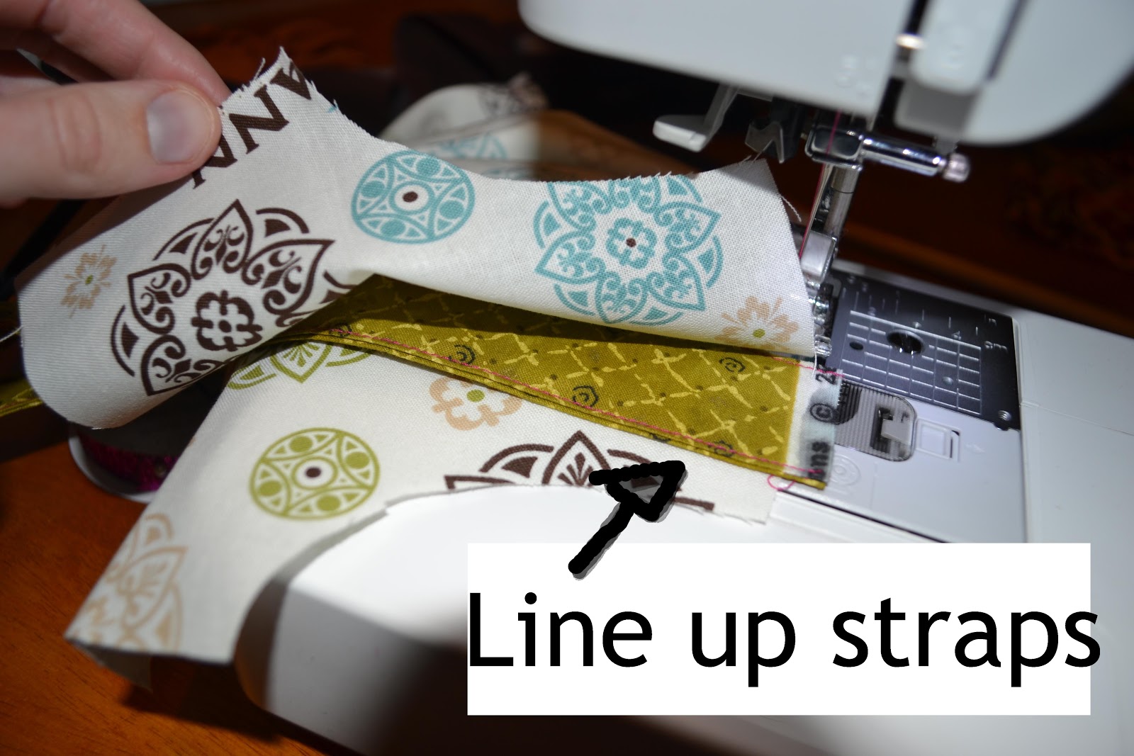 I start off by putting a safety pin in the middle of the shoulder straps. Just below the fold. Remember to put it on the right side (rs) of the fabric so when you sew them you can push it through to turn them rightside-out.