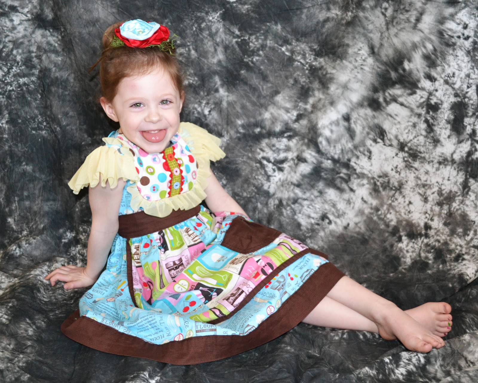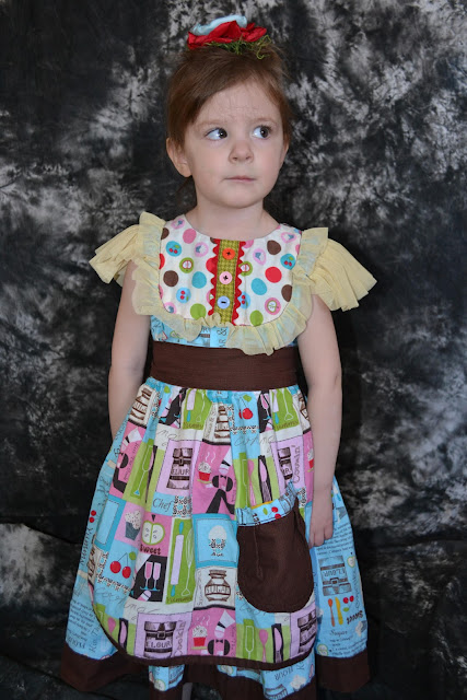 For my next idea, I had this super cute "cooking" fabric I wanted to use for a dress. I added another bib and some flutters sleeves and instead of a sash, we made a cute little apron. Here's the completed outfit: