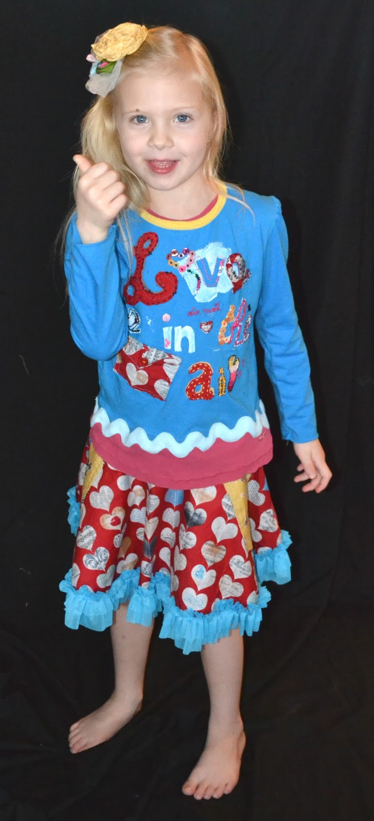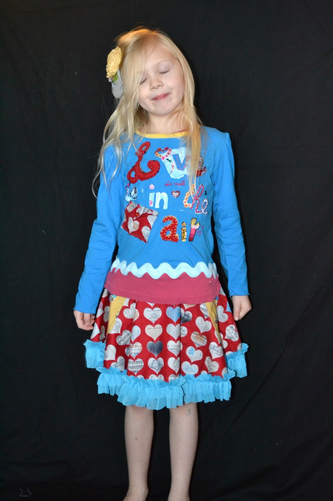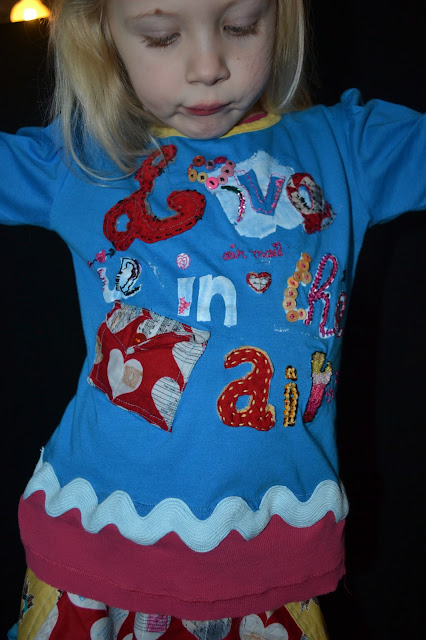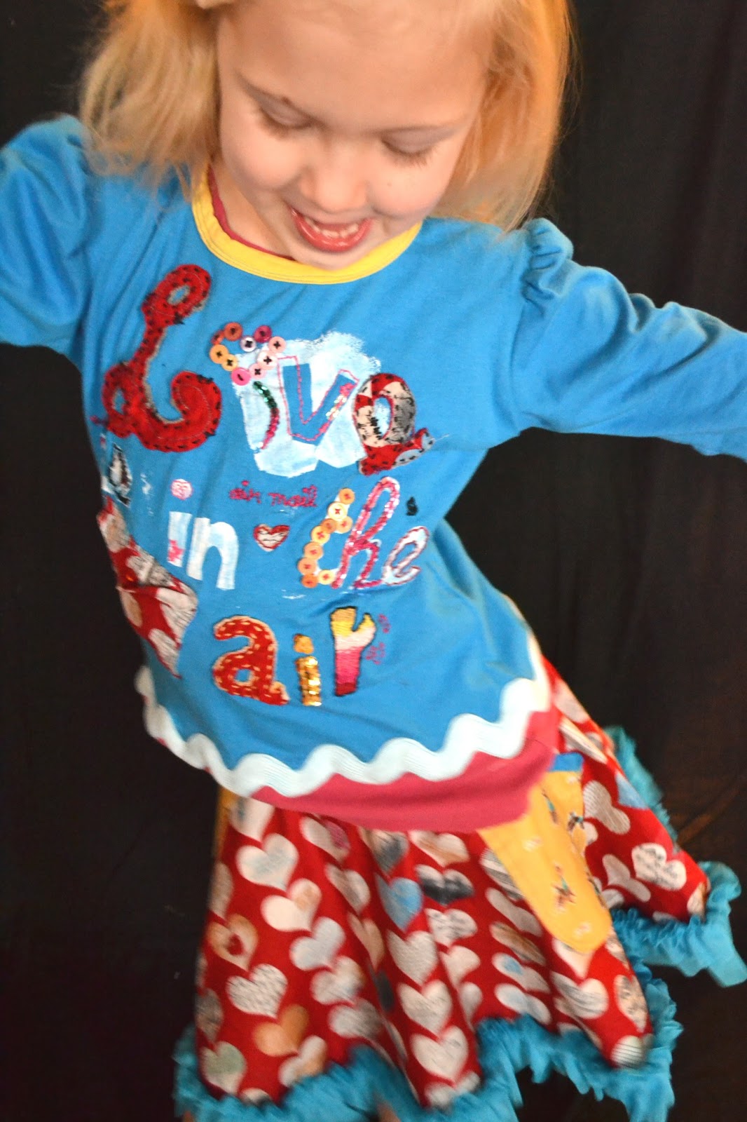 I saw that Giant RicRac at Joanns the other day. I think you found the perfect use for it!The whole thing turned out great! I love all of the appliques and embelishments on the shirt, and that fabric for the skirt is really neat!