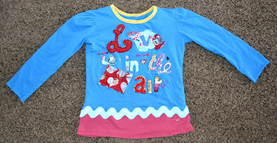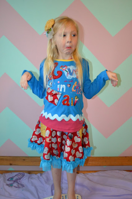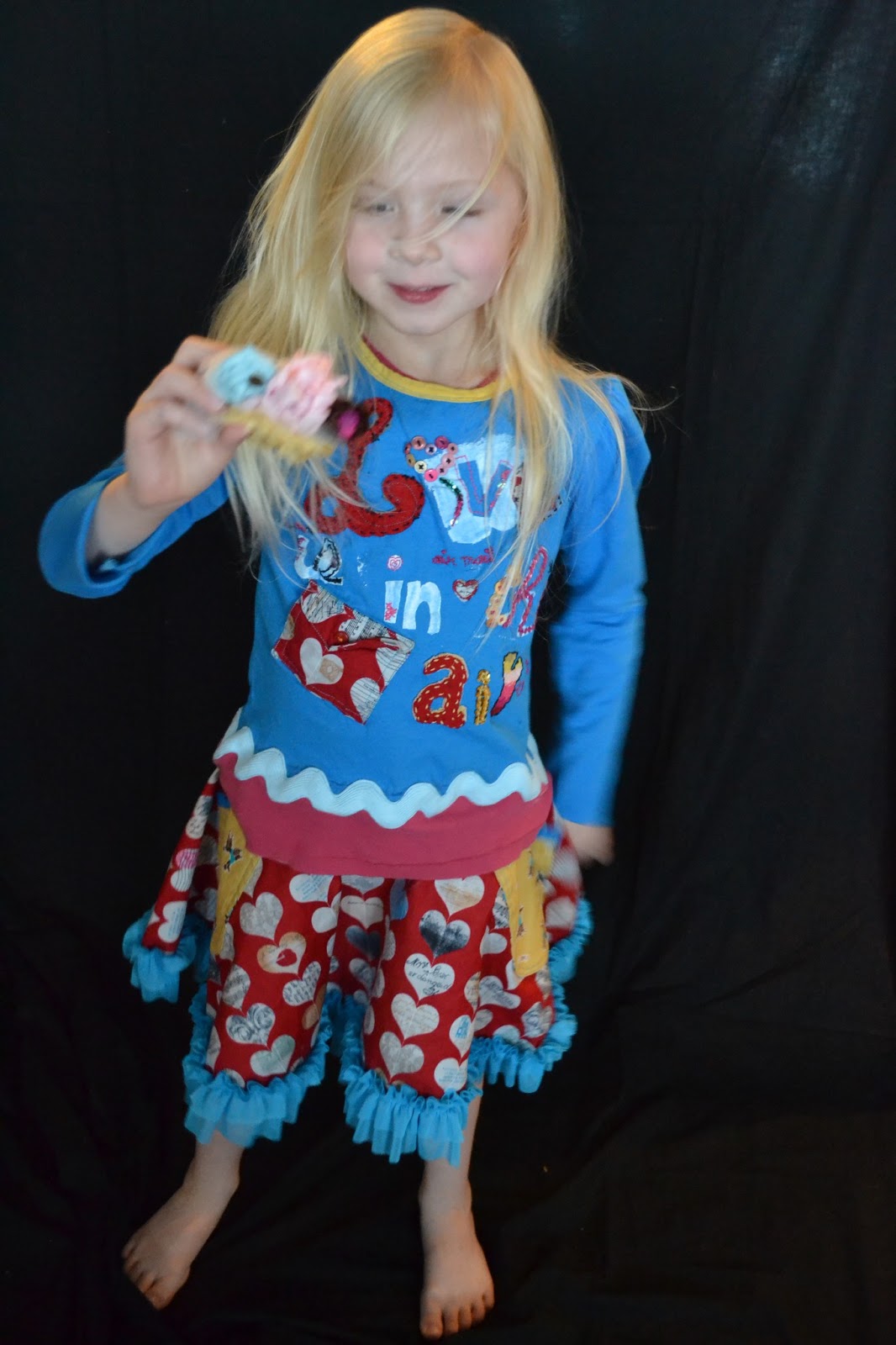 So this lovely shirt was washed and although I did prewash the fabric, it still shrank! When we put it on Aevs, It barely went past her belly button and definitely was a belly shirt whenever she tried to move. The bad thing was, no more blue knit......I looked at what I had to try and go with it and saw that I had an old dusky pink tank top in my stash. So I kind of tried to make it look like a double layer. It just really wasn't working though, and that's when the huge ric-rac came in. Besides my apprehension, my daughter really wanted it and hey, if she loves it that's all that really matters! So here is the complete shirt. Her favorite part is the little butterfly at the bottom. lol