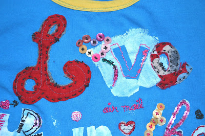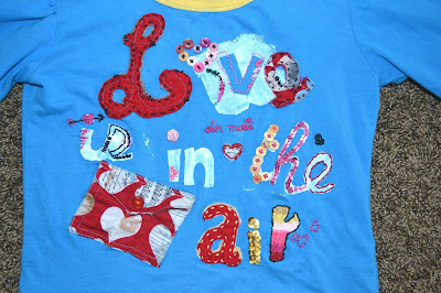 For the shirt, I absolutely LOVE Gap's embellished shirts and have been wanting to make one for the longest time. Of course I used "Love is in the air" for my saying. I first used some Freezer Stencil's for some of the letters. Then decided which would be fabric appliques, buttons, sequins and embroidered. I also decided to add an "envelope" pocket for any and all love letters. I love how it turned out!