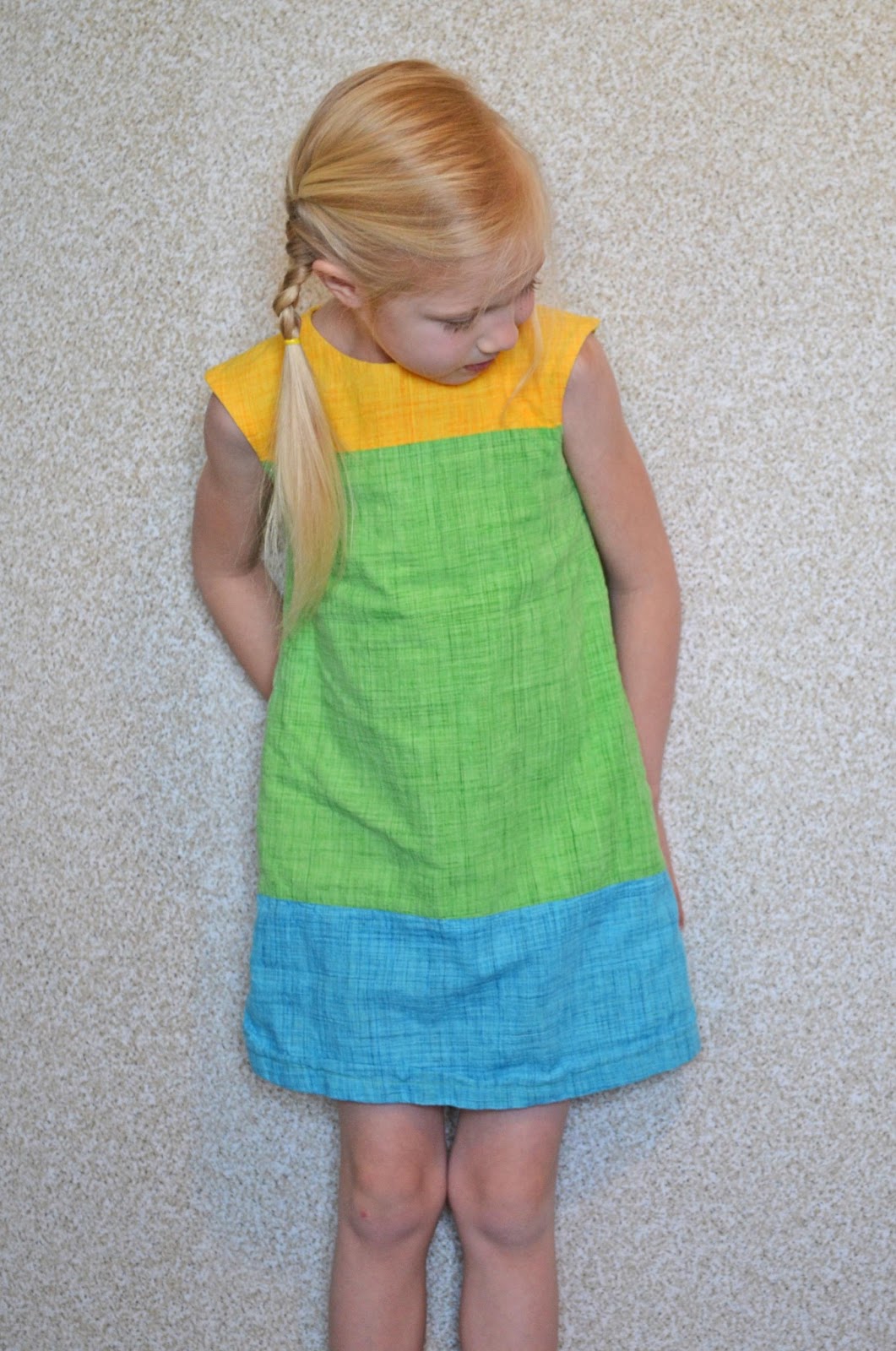 This is for their "Color Block Dress". She said we could dress it up however we like, but when my eyes fell on these linen solids that I had in my stash, I couldn't resist and ended up keeping it how it was. I've knick-named it her "Color mixing dress". Cause you know, yellow and blue make green. :D Does anyone else knick-name their kids outfits?