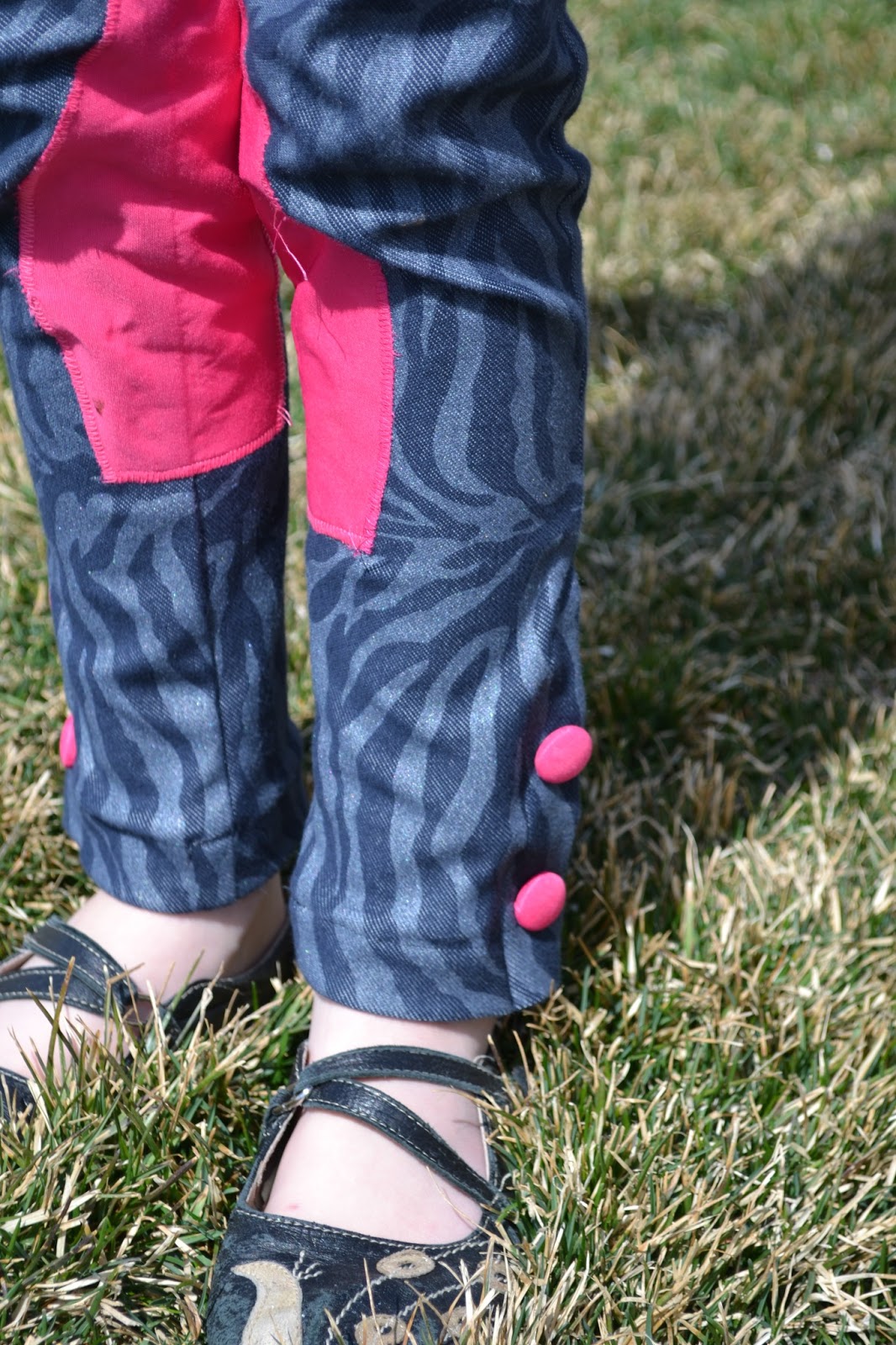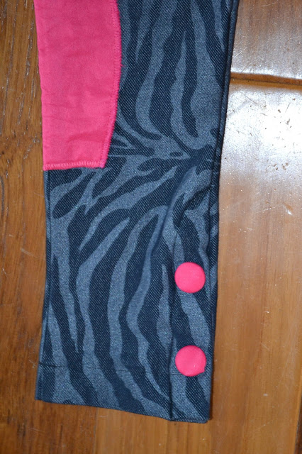 I used some zebra stripe stretchy jersey fabric. For the buttons I thought I would have fun and try out fabric covered buttons. I used a shocking pink microfiber material for the patch and to cover the buttons. I really can't believe how easy these were to put together! :D
