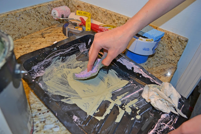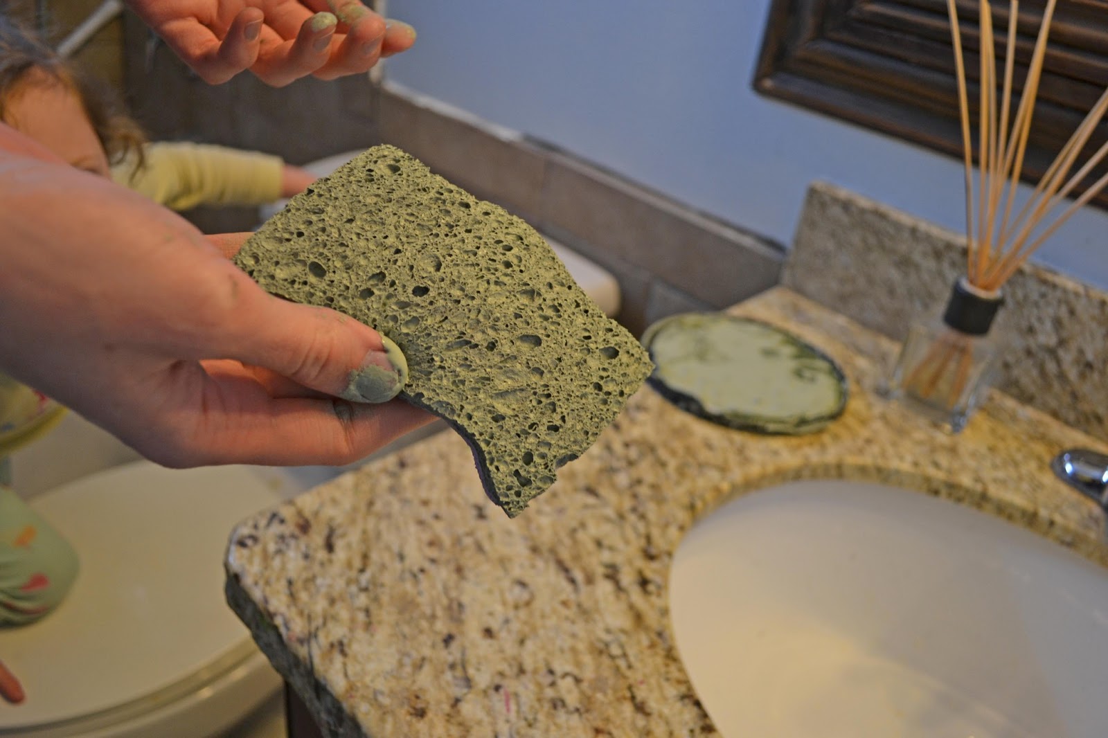 Put paint on sponge (just enough to get it wet, you should still be able to see the "spongyness")