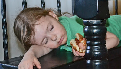 It's finally decided to warm up so we've been outside quite a bit. We cleaned off our porch and cleaned off the girls play house and all of our benches and planted some rose bushes.The kids have been having fun in the sprinklers too. Yesterday we were at our friends house playing in the water and all this time in the sun is apparently wiping Paisley out. She didn't even make it half way through dinner and fell asleep with her hotdog in hand.