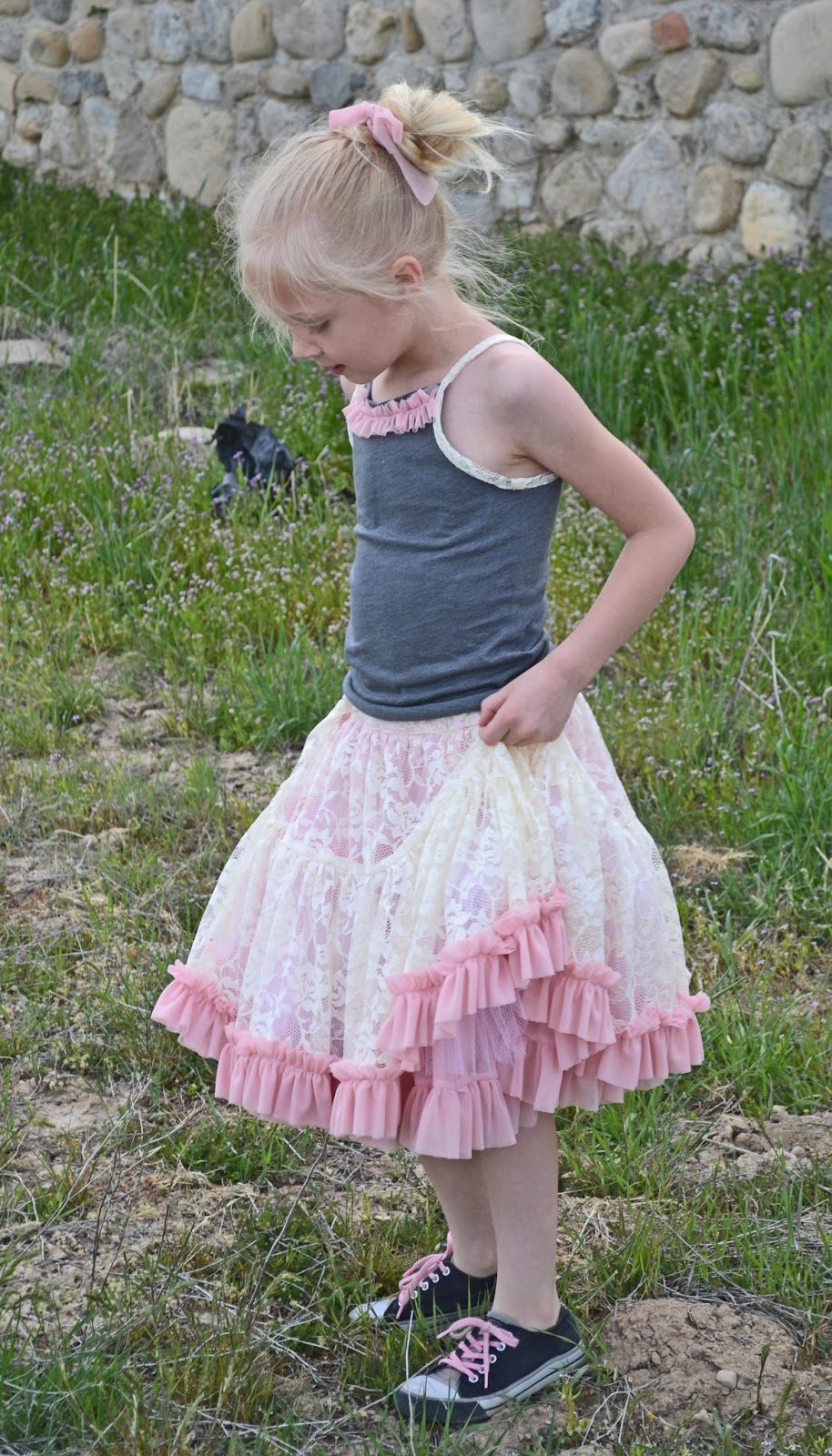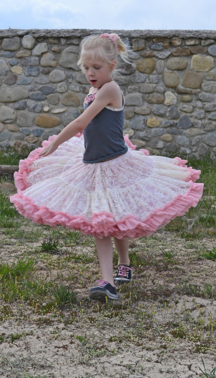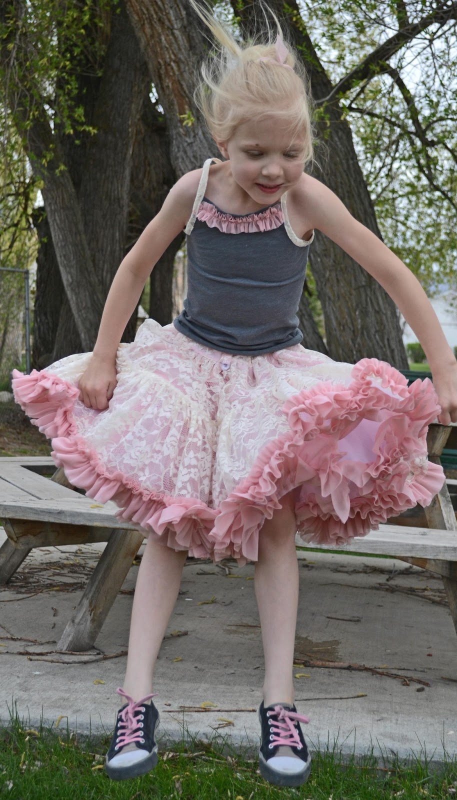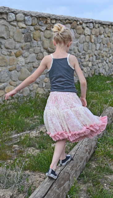 We made the Verushka tank top from Ottobre 1/2013 to go with it. I just added the ruffle at the top and used the lace for the arms to tie in the skirt. I love the charcoal knit with it!