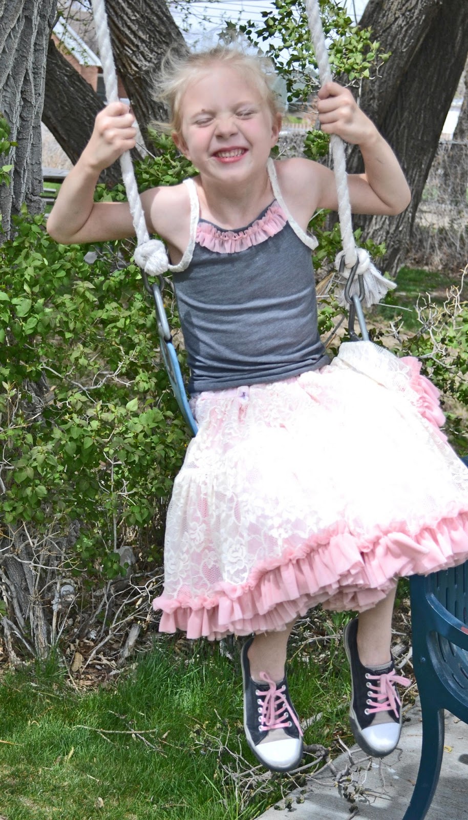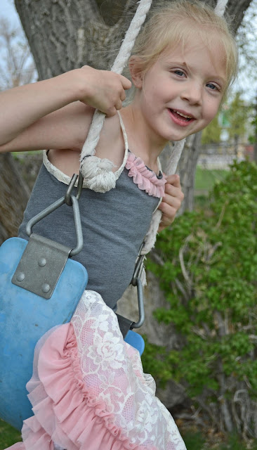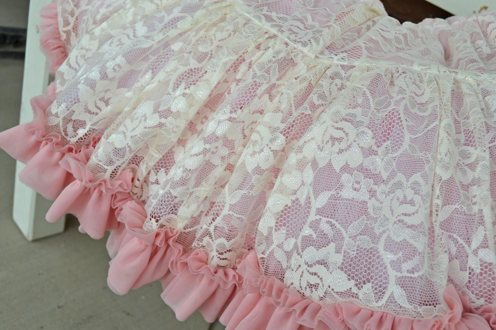 Aevaries last pettiskirt was very purple with pink and blue ruffles. Adorable, but very childish, so I chose to try and make this one a bit more mature. I found some cream lace at the store and a salmony-pink chiffon and love the colors together. The best part was that the chiffon was on sale for $1 a yard! Seriously made my day!