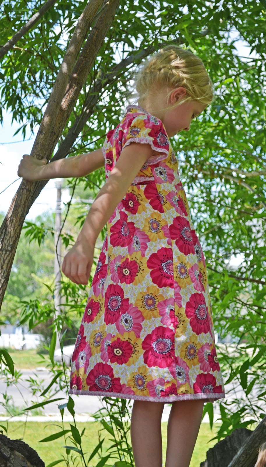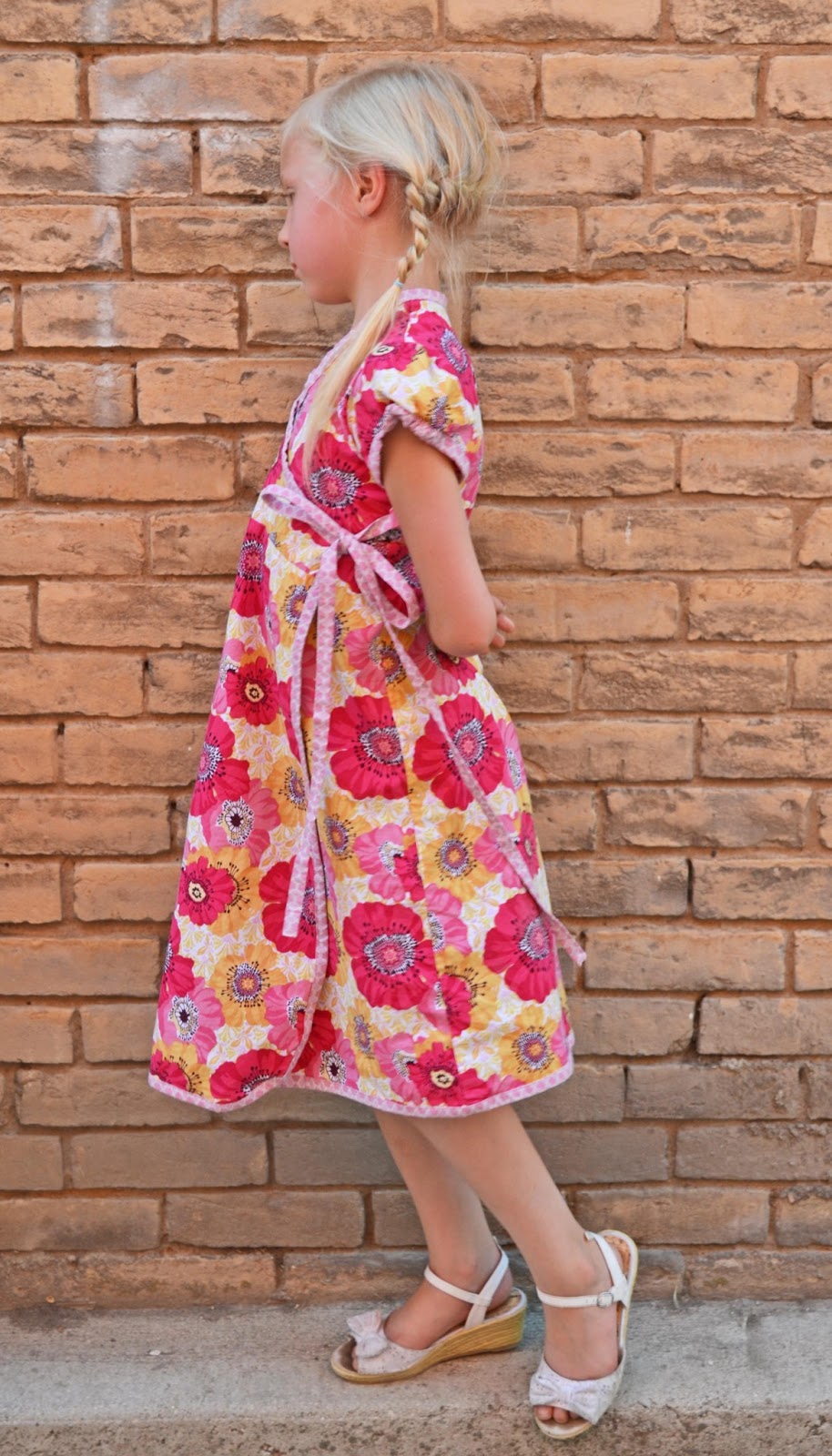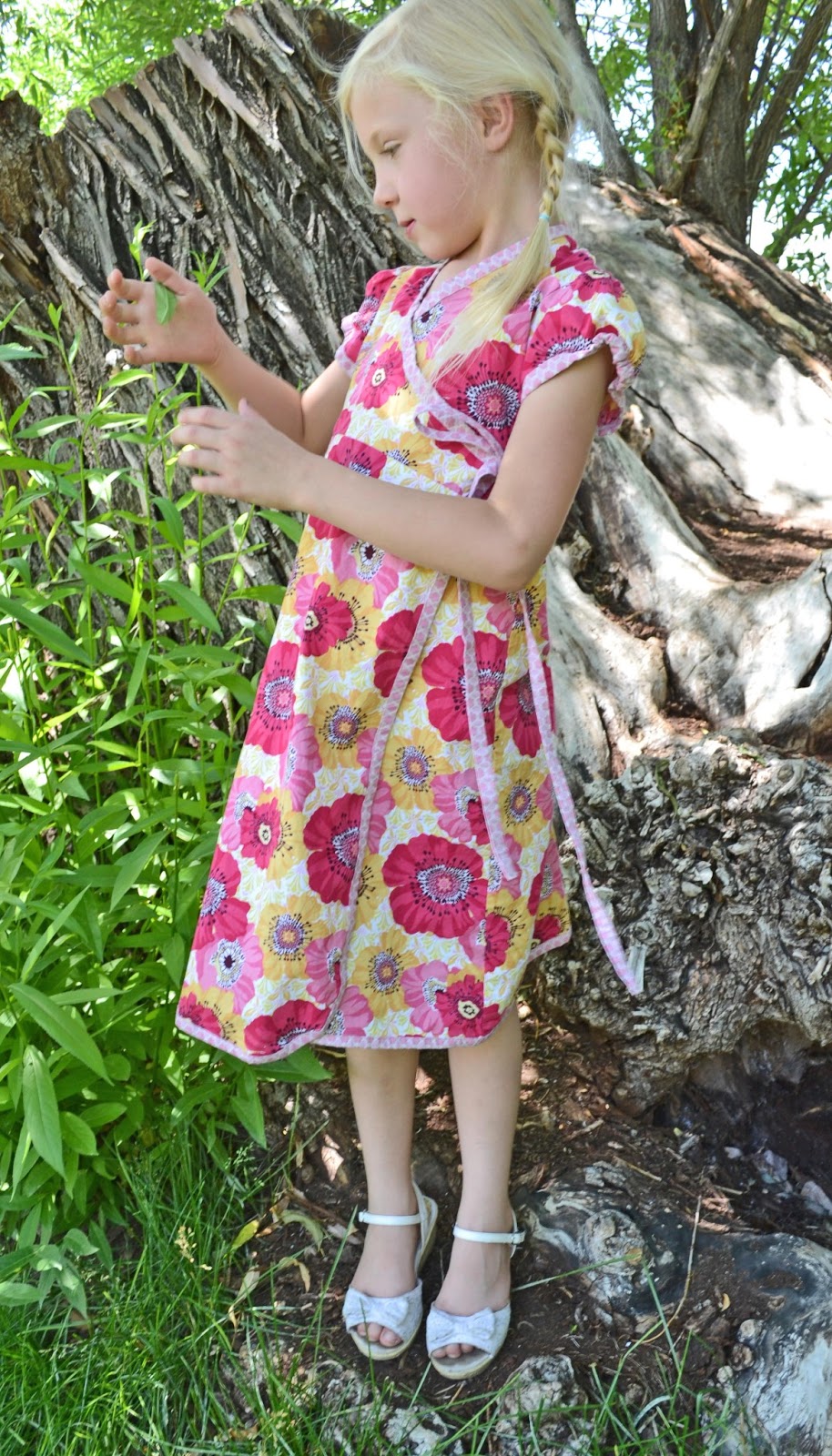 Now, I don't know about you, but I've made all the summer clothes that could possibly fit in my kids wardrobe and have started looking for patterns for the upcoming school year. And with school, comes a dress code. SIGH - When my eyes fell on this dress I was drawn like a moth to the light. This is one that easily fits into all of dress-code criteria. And honestly, I love the kimono cross-over thing going on. I really could not wait for it to come out! Did I mention that the sizing is from 6 months to 12 years! You read that correctly, 12 years! With a 6 year old that is outgrowing size 8, my options have been growing slim. So I was ecstatic that this pattern will still last us some good years!