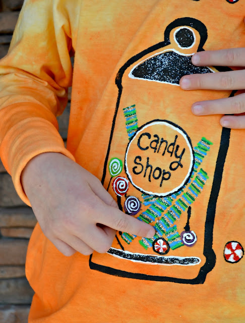 I used the Recess Raglan pattern, but wanted to add something to it. So, I traced out an apothecary jar (like one of the ones from the fabric lining her hood) onto some freezer paper, ironed that "sucker" on and painted candy in it.
