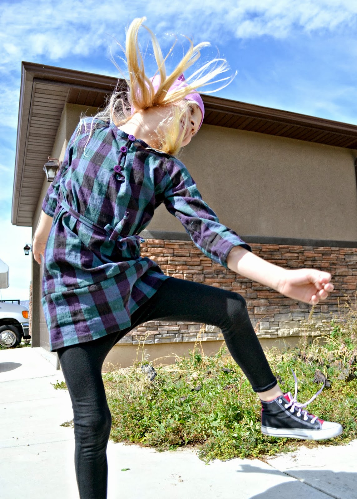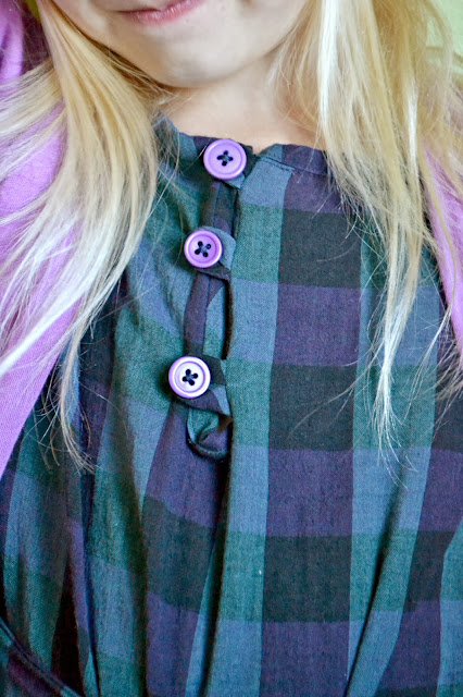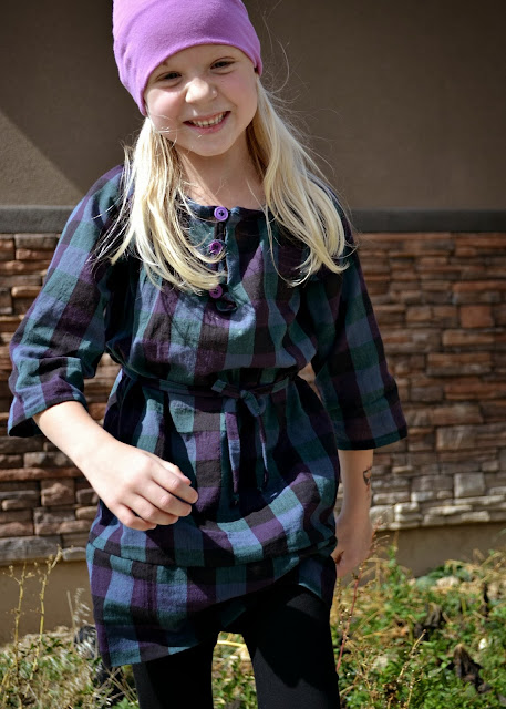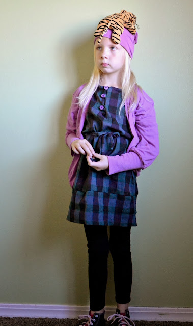 She looks happy and like she's having fun with you so the outfit is a success. the plaid tunic with the pop of lavender is perfect.