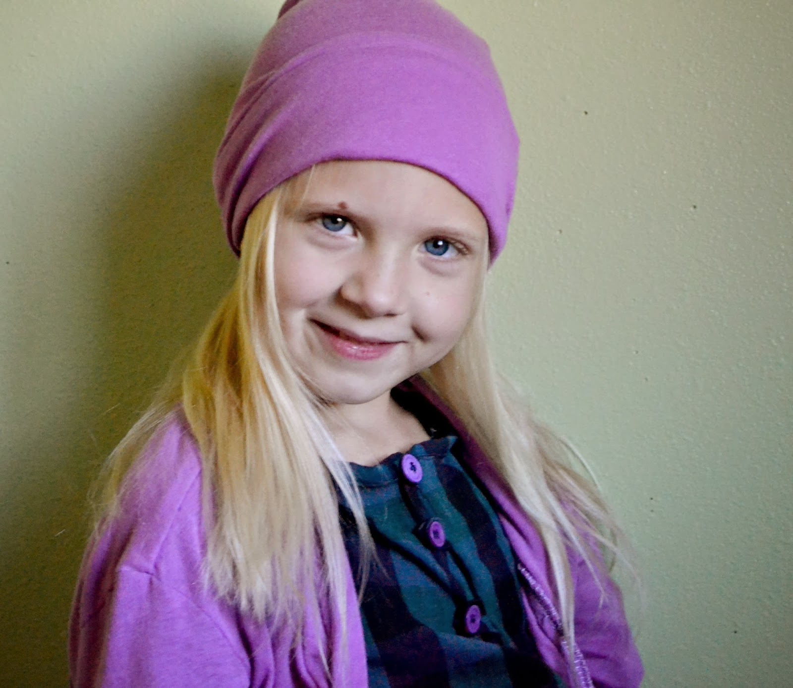 Then the little hat, I just cut out a sqaure, sewed up the two sides and added a band on the bottom. The thing fits me. lol But she loves it and it will keep her little head warm in the winter.