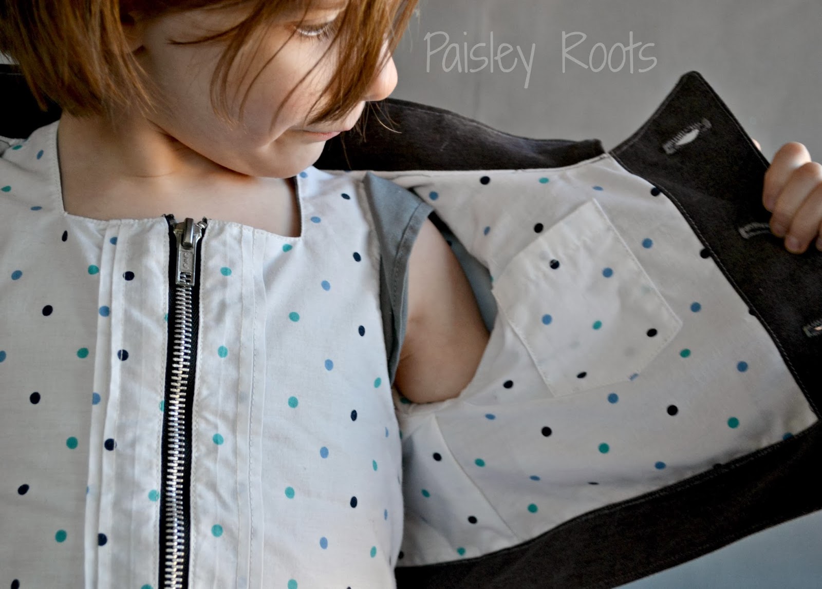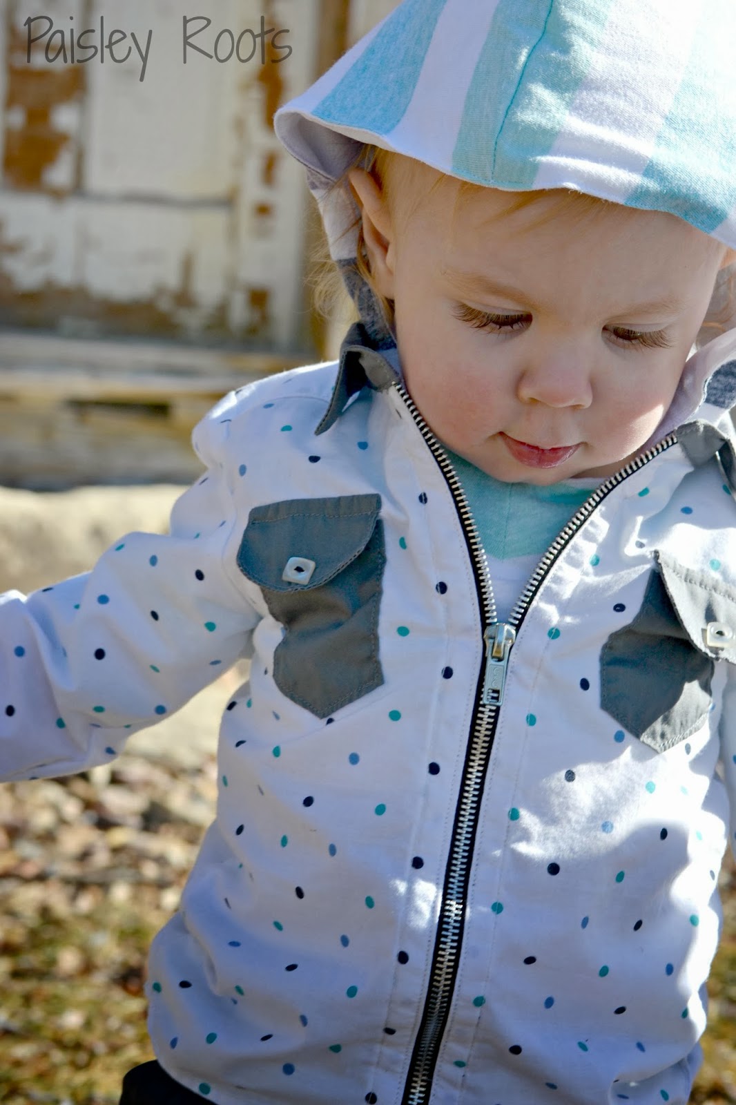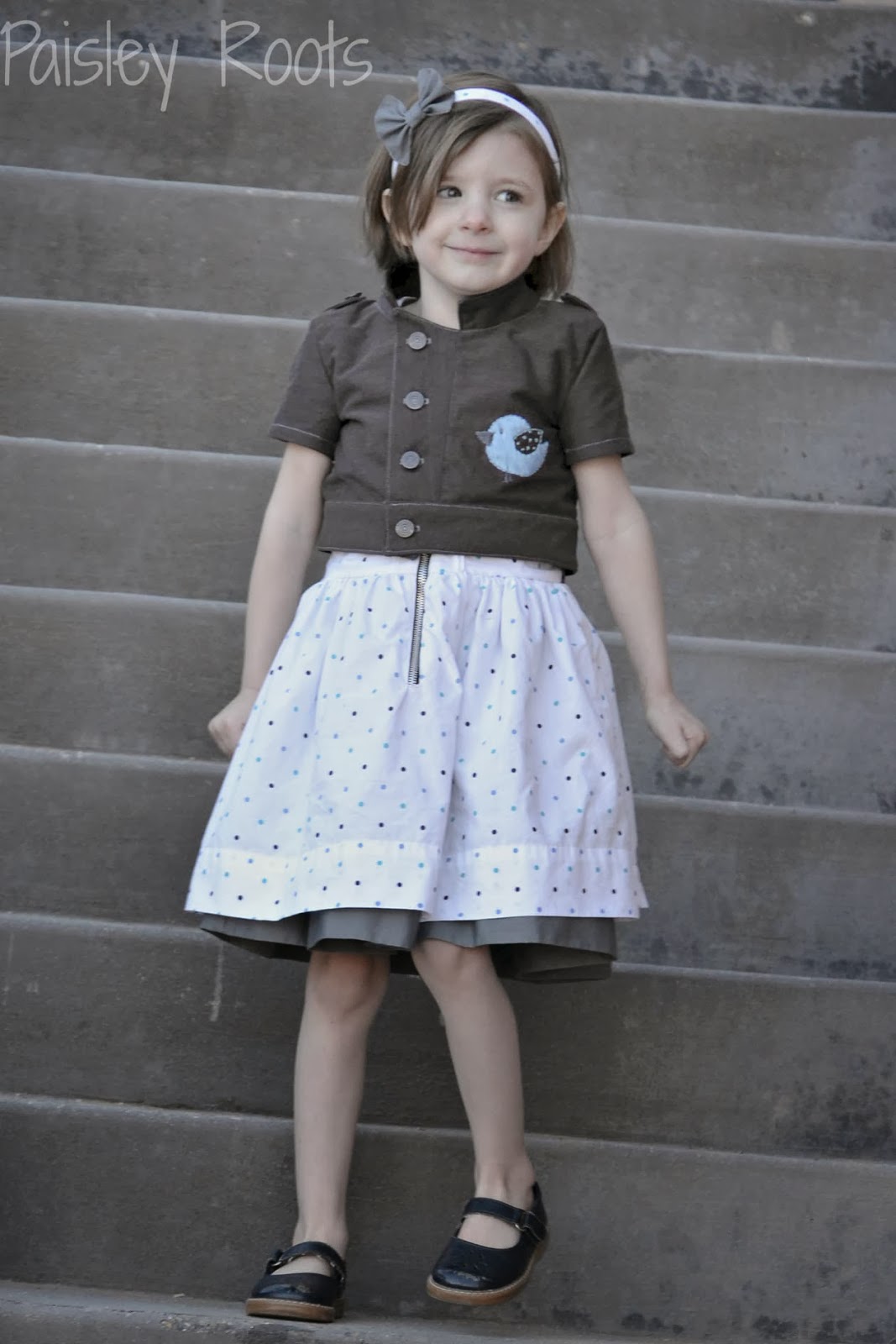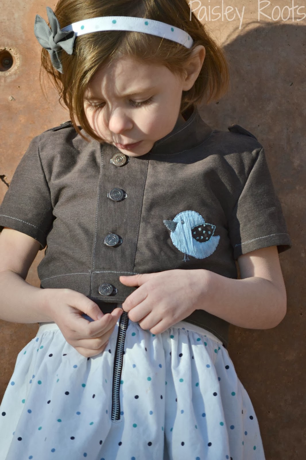 I modified the coat to be a jacket. Cutting the sleeves short and adding a band at the bottom to come right at Paisley's waist. With spring in mind and the zippers, I just knew a little blue bird should be embroidered on the front of the jacket. The shoulders were already accented with the tabs, but the front was perfect to have the bluebird!
