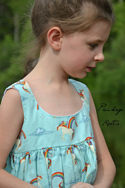 I made it in Unicorns & Rainbows fabric from Riley Blake that I bought from Phat Quarters on Etsy. I know Unicorns don't exactly scream "travel" in a sense, but really they do. Paisley was transported to a very magical kingdom where everything was green and beautiful.