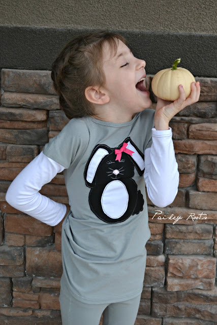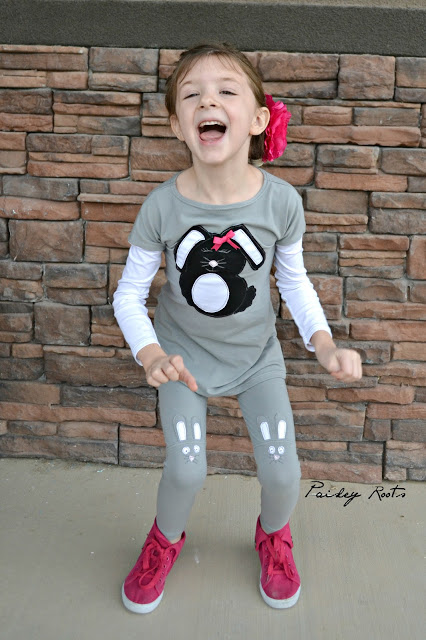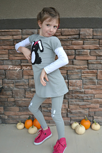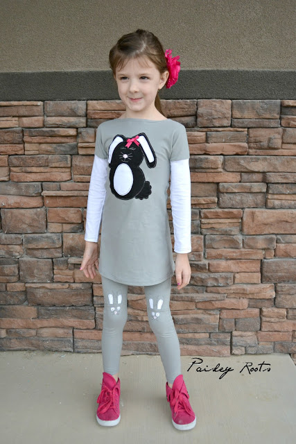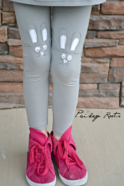 I cut the leggings pattern in half and then marked where the knee would go on the front and cut a curve above that. I then just cut out random bunny ear shaped ears and circles for eyes to FMA on. I know they aren't perfect, but I think they turned out perfect for this look!