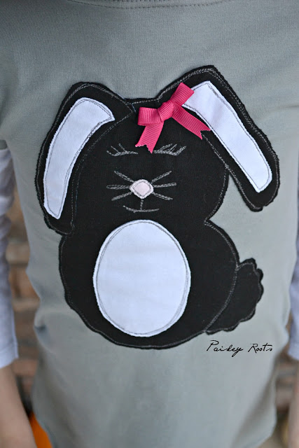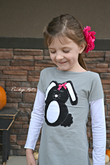 The A-line dress was perfect to do some free motion applique, so I used the Bunny from the Bubble Pets from Stitch Art Designs. Paisley again chose for her bunny to be black and it turned out adorable.