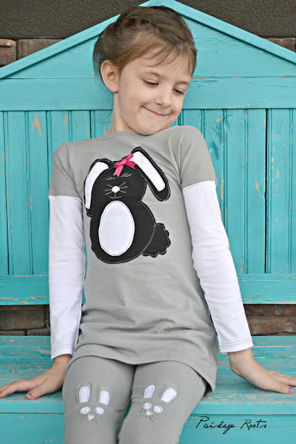 For the top I chose Jocole's A-line Shift Tunic & Dress. I made the tunic length size 6 and went with contrast sleeves. Paisley chose the Grey Jersey from Phat Quarters fabric (seriously my favorite fabric shop!) and said she wanted a "bunny dress".