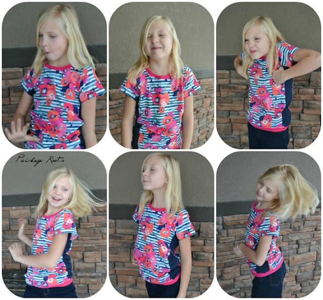 I'm loving this! I wasn't sure how the style would look as a girls tee, but it definitely works! The fabric choices... #love. The side panel is a great feature too! It does add a little something to the style. :)