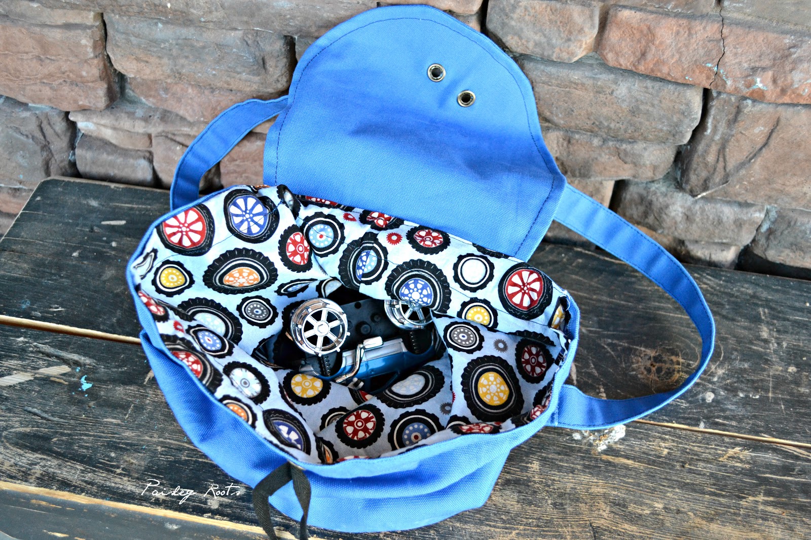 The inside was a fat quarter that I have no idea where it actually came from. I had been scratching my head on what to make with it and this was the PERFECT project for it! This kiddo takes after his older brother in loving all things that GO.