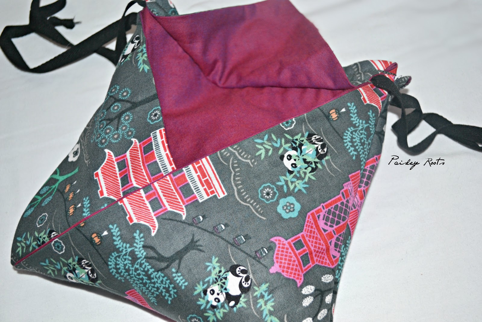 For my origami bags, I used Minshan Panda Temple on Slate with Cherry Peppered Cotton for the inside. The other bag is Minshan Red Panda with Coffee Bean Peppered Cotton. The peppered cottons look fantastic with this line!