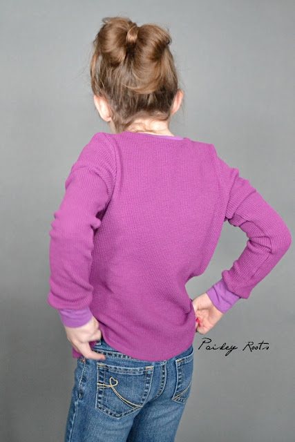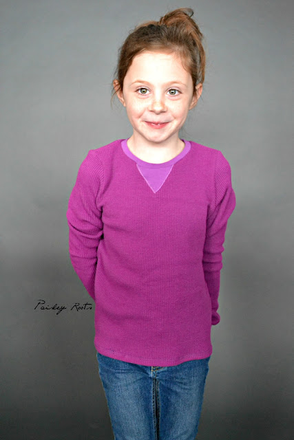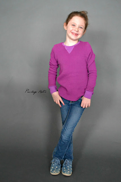 I have been dying to make my kids and myself a thermal shirt, but good thermal is soooo hard to find! This thermal is nice and thick and I knew as soon as I received it that it would be perfect for this very persistent snowy weather we have all around us. It comes in two colors, Beetberry and Blueberry. I went with Beetberry because the color makes me happy. It's bright and fun and I knew my girls would love it.