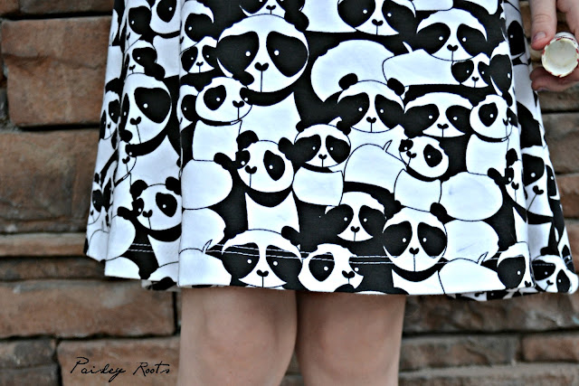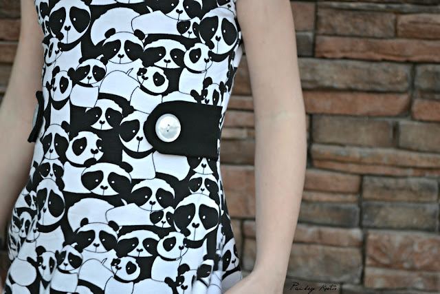 I've been hoarding this fabric by Jeanine Thomlinson from Stitch Art for a few months now just waiting for the perfect project. As soon as I had this pattern cut out, I knew the panda's had found their destiny. Ooh! The button tabs are rather awesome too and they had to be an option chosen for this dress!
