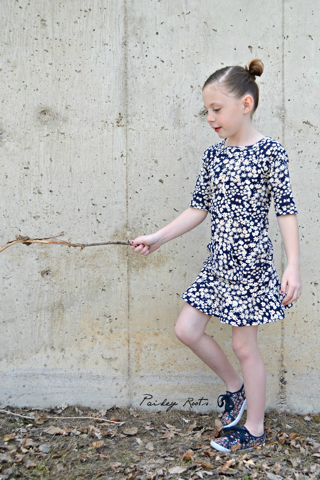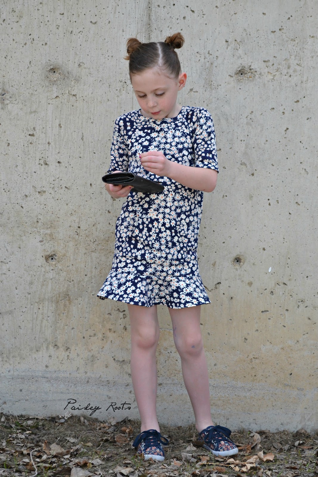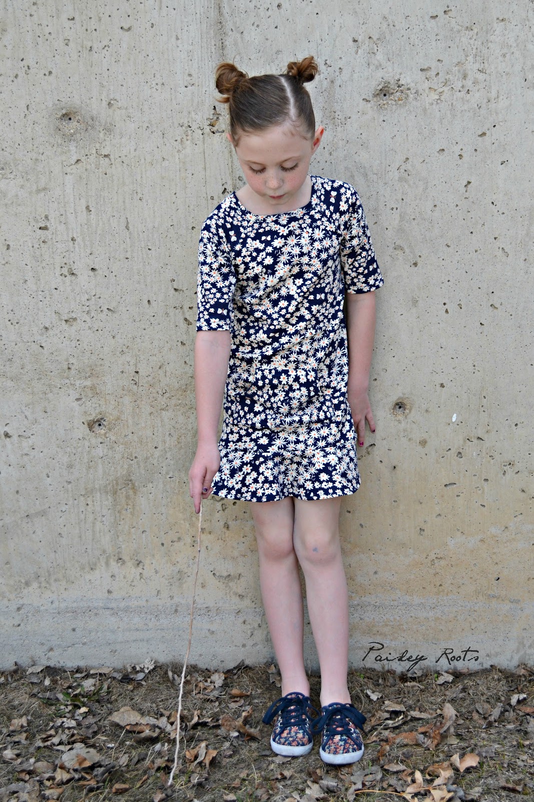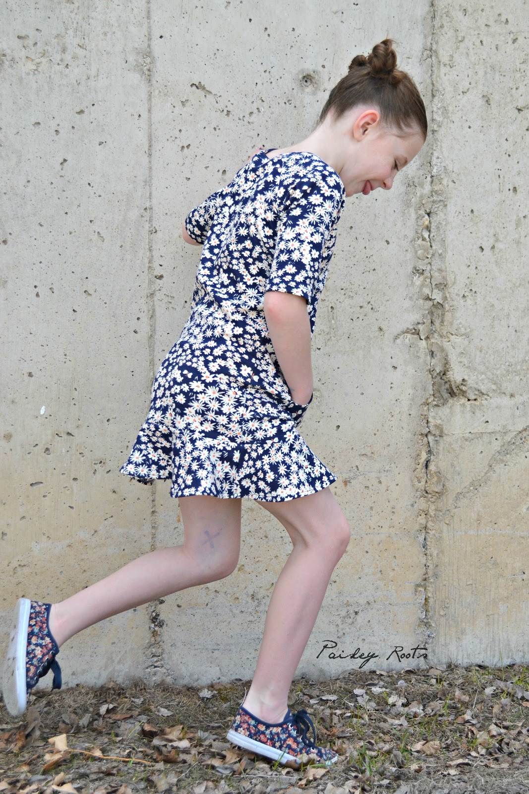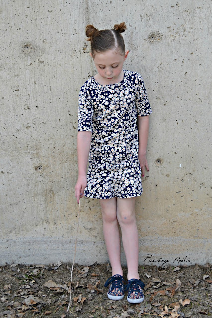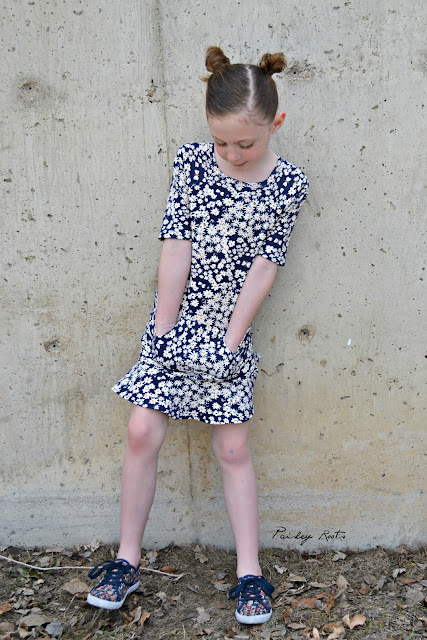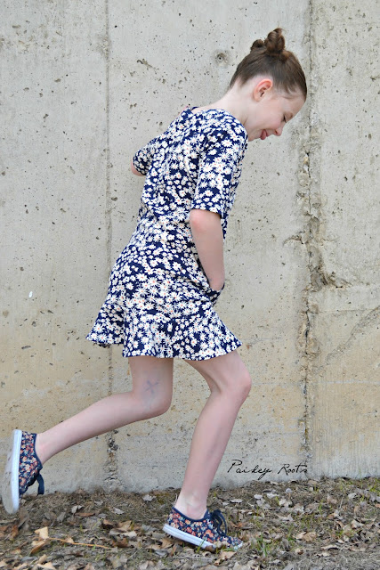 The dress features raglan sleeves, a kangaroo pocket and a super fun flounce. I made it out of Birch Organics Homestead Daisy Bed Storm knit that I bought from Phat Quarters and have been hoarding for just that "right" project.