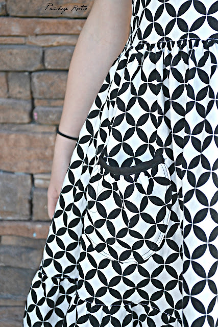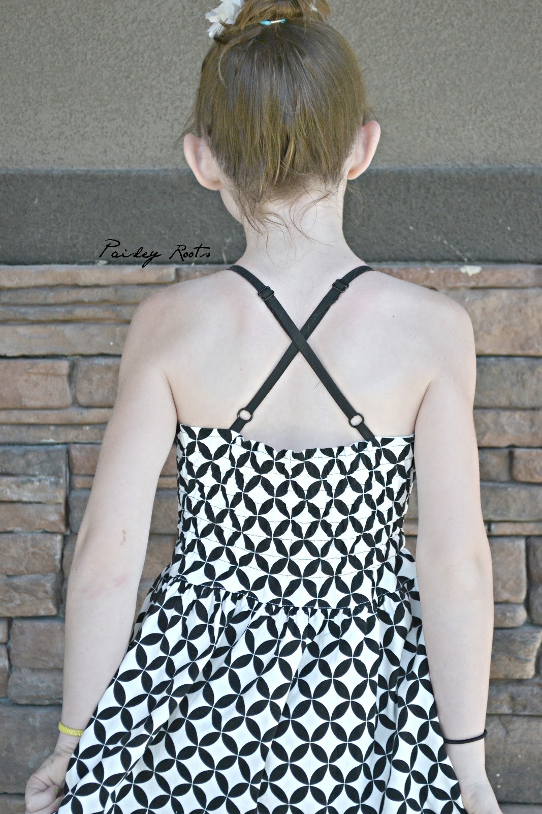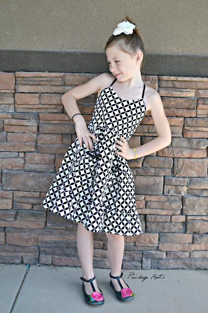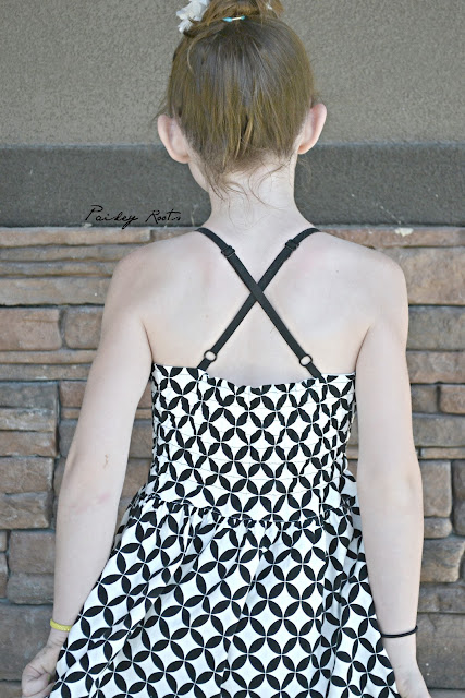 I did change the pattern up by adding adjustable straps. I'm just not really a tie girl and the adjustable straps are so easy to make. The fabric is from Joanns which has been sitting in my stash just waiting for the perfect inspiration to come. I thought about adding a pop of color with some ribbon or something, but I really love the black and white and being able to add the pops in the accessories!