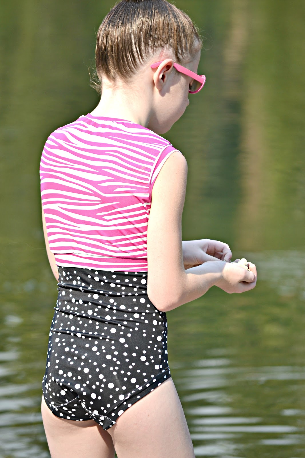 Today I'm showcasing The Wolf & The Tree's "Just Keep Swimming Rashguard". I did end up hacking it just a little. When Zoe tried it on before I put on the waistband to the bottoms, I realized they came all the way up (my kids and their short torso's!) so instead of cutting off some from the top of the briefs, I just sewed the bottoms to the top of the suit. The neck is very accommodating for easy on/off and I couldn't help it!