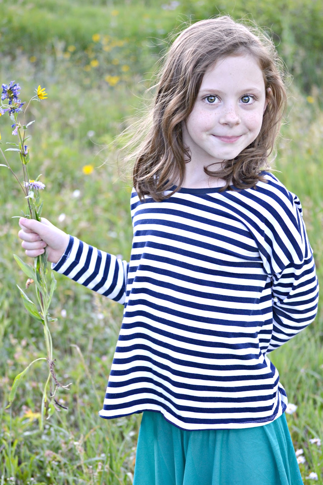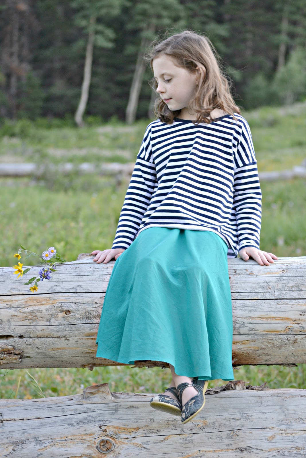 In the picture the girls shirt is a dolman top with sleeves and of course the Hey June's Morrison Tee was a perfect match! I do have some sweater knit that I was tempted to make it out of, but that stuff is going to go to a sweater for me, so instead I ordered some Riley Blake, Navy & White striped knit for it. I think it turned out rather perfect and I am so needing an adult version of this top! I absolutely love it!