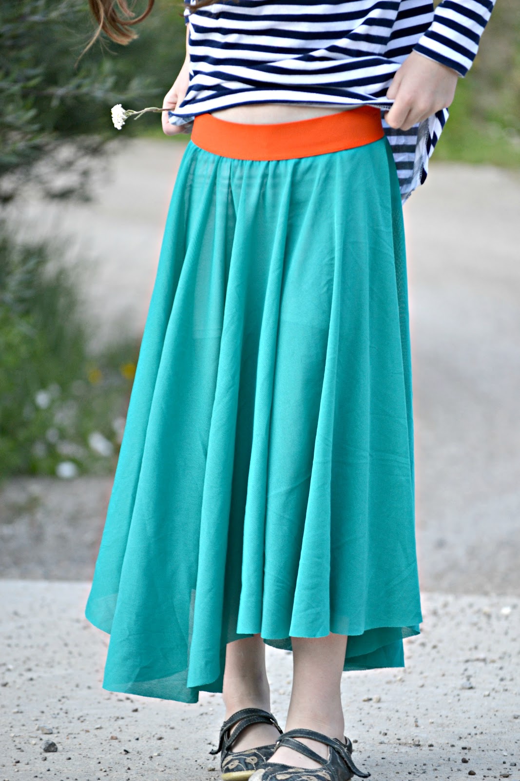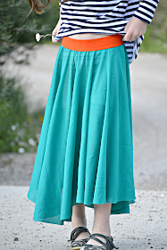 For the skirt, I used my Cinnamon Circle Skirt pattern. I did lengthen the skirt, and instead of doing a waistband casing, I just cut the elastic measurement out of some orange 1.5" elastic that I bought from Joanns ages ago and used a double needle to sew the skirt part on. I'm not sure why this is the first time I've made a skirt this way. It's so stinking easy and adorable. The skirt material is some teal mesh that has been in my stash for ages. I'm pretty sure it was $1 fabric from Walmart.