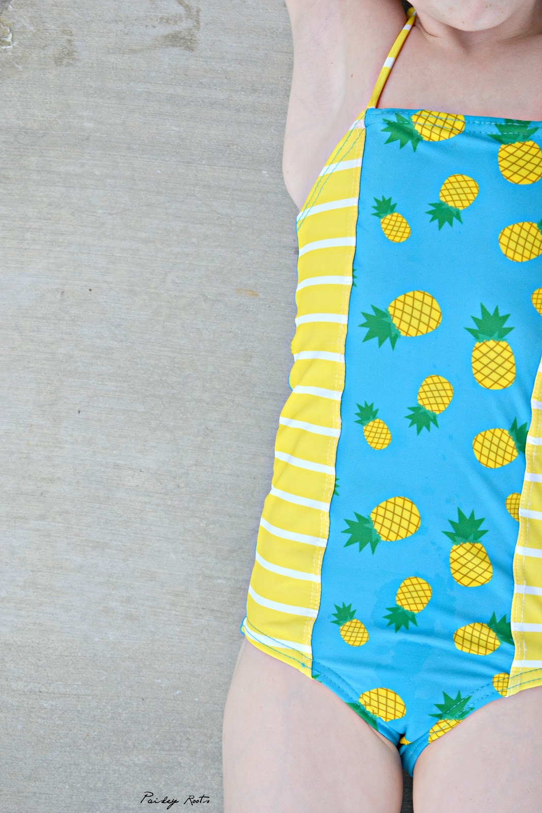 Then for Zoe I made view B with Pineapples & Stripes, both in that same grab bag as the polka-dots from Peek-a-boo Fabrics. She has some seriously adorable swim designs. We may have bought the Mermaids, Pirates, and skulls too.......