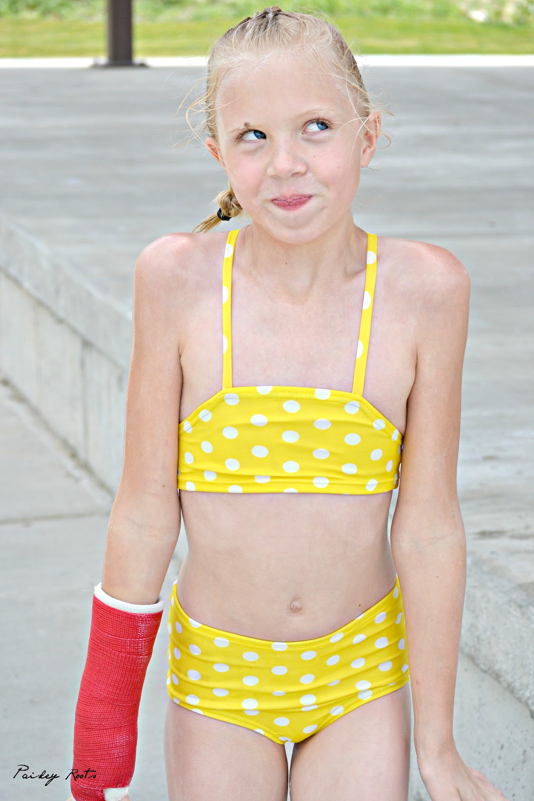 This was supposed to be for Paisley, hence the "itsy bitsy" top....BUT it is an "itsy bitsy, teenie weenie, yellow polka-dot bikini"...sooo...it kind of works. I was seriously dying with how determined this chicken was being that this bikini was hers. The bottoms fit her perfectly, but we'll be making a rash guard soon. The yellow polka dot swim is from Peek-a-boo Fabric Shop. I got it in a grab bag and as soon as I saw it I knew it was destined to be turned into a bikini. This is the view G option of the Cosi, just without the frills.
