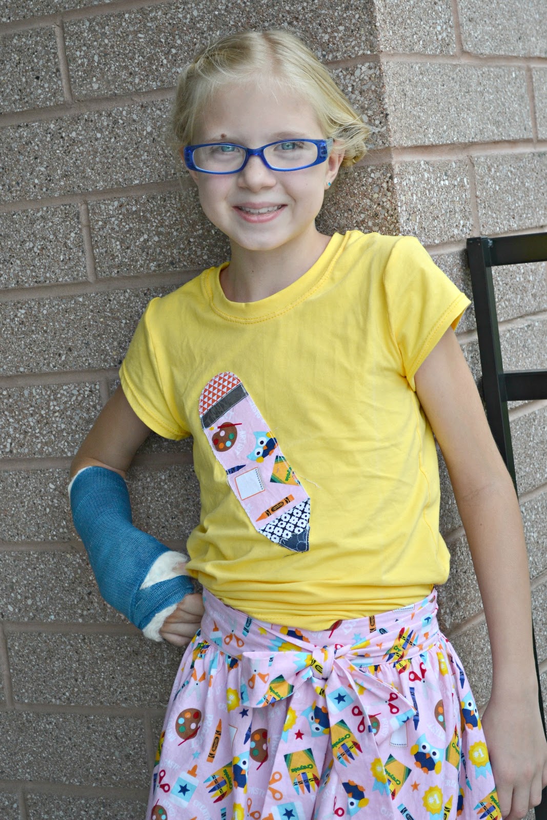 For her top we made the Charlotte Collar Top in Riley Blake Solid Yellow Knit and modified the collar with a neckband to make it the perfect t-shirt. We added a Back To School Pencil free motion applique by the Crafting Fiend. I can totally see this shirt being a staple for the girls. Those cap sleeves are just so perfect!