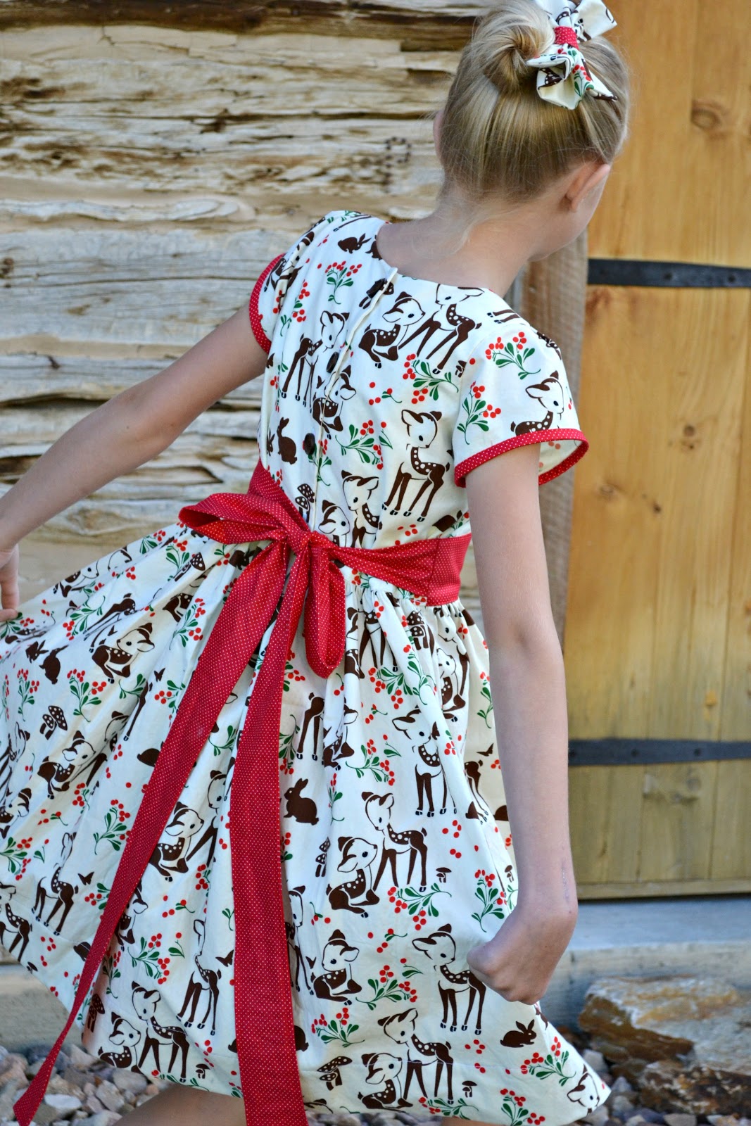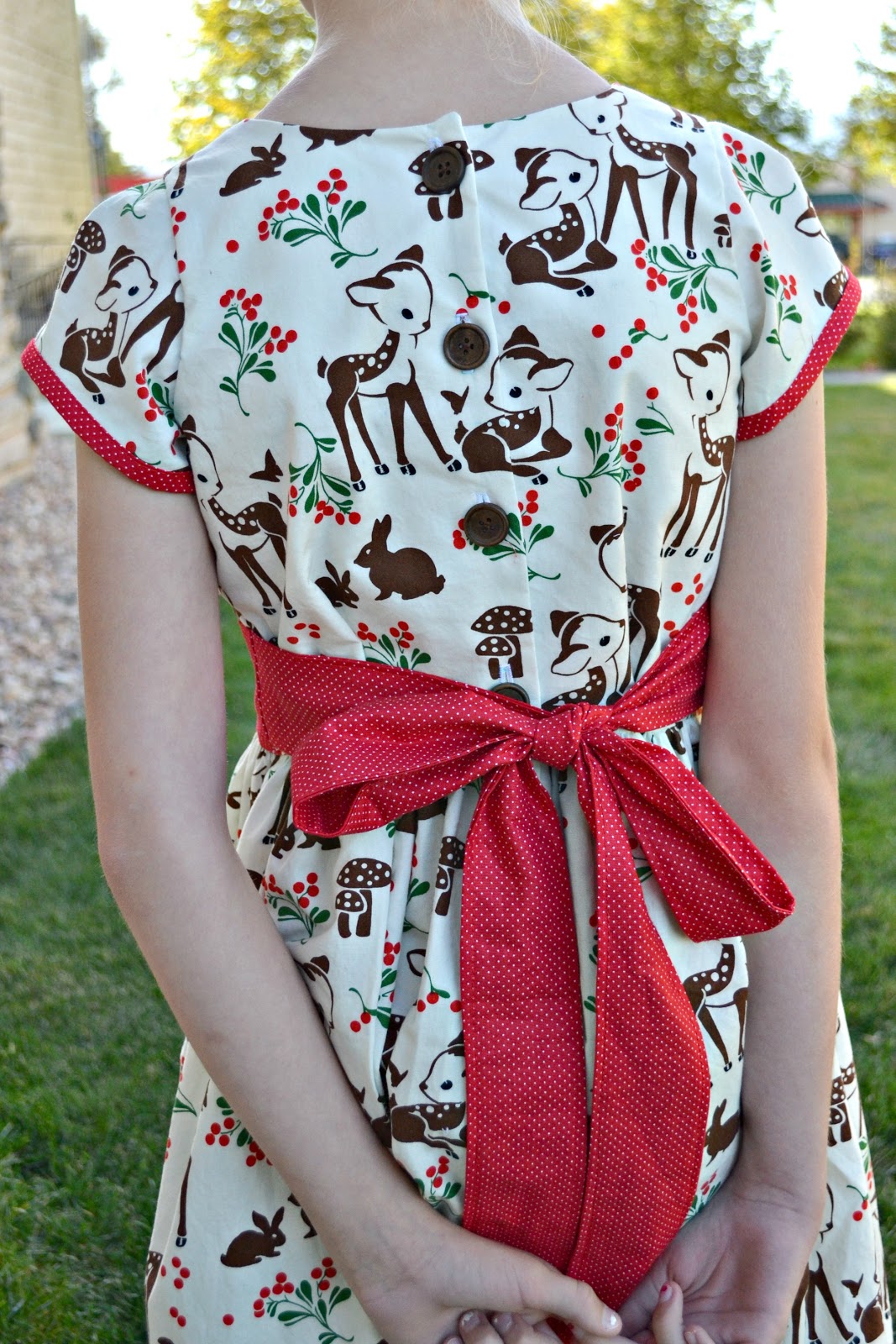 I had to get the back to line up. That little baby deer was too darling to chop in half! I chose to use wooden buttons too. I'm really in a wooden button kick. They matched the feel of the dress so perfectly though!