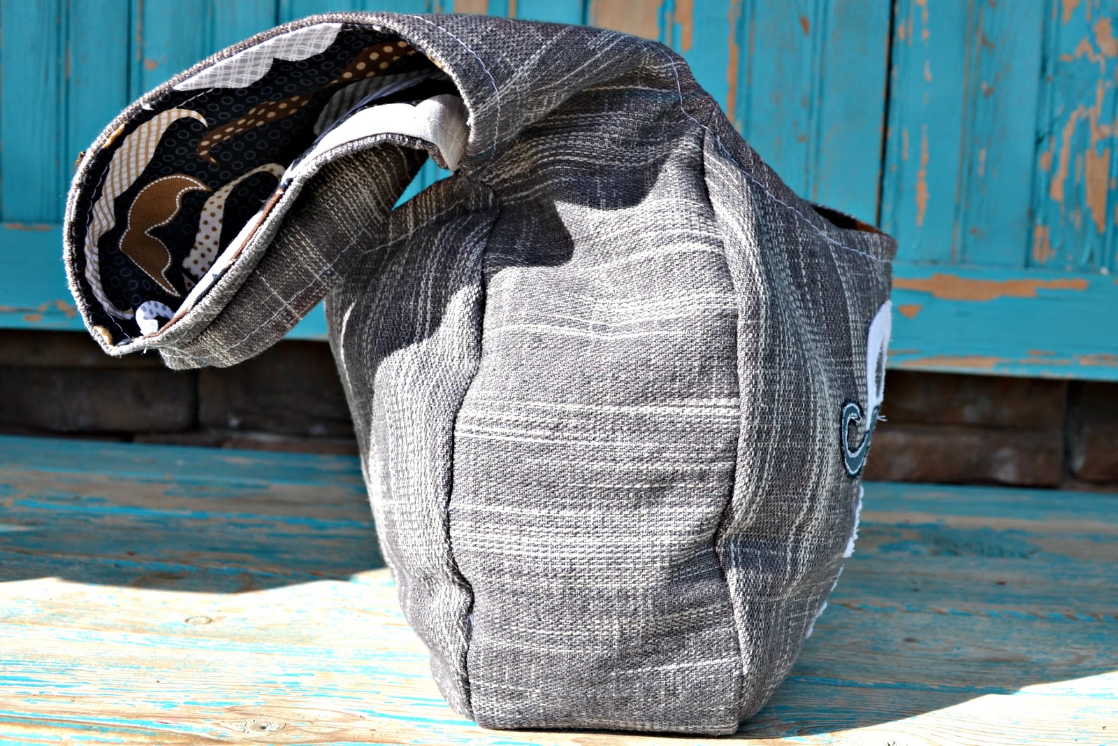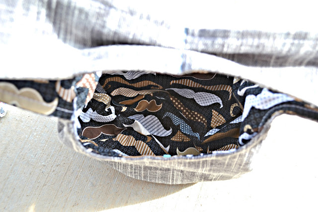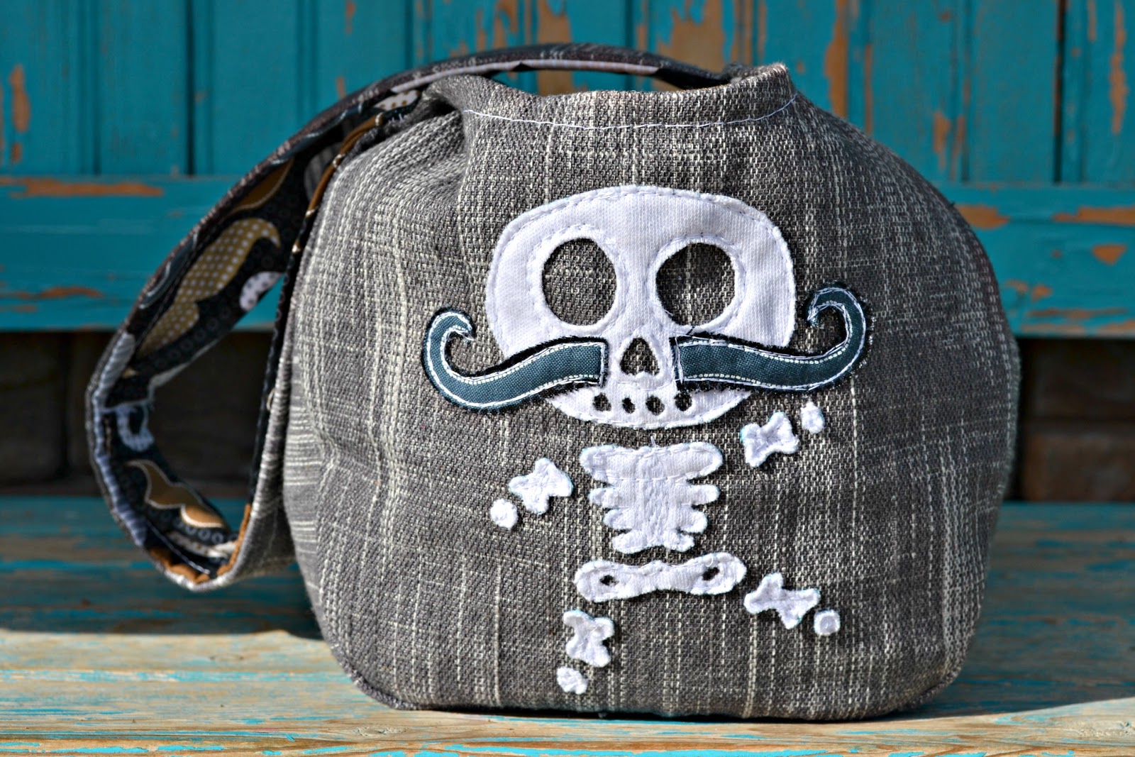 I couldn't resist adding a fun Free Motion Applique (Designed by Stitch Art) and since I used my coveted Moustache fabric for the lining, I couldn't resist giving Monsieur Skeleton a wonderful moustache of his own.
