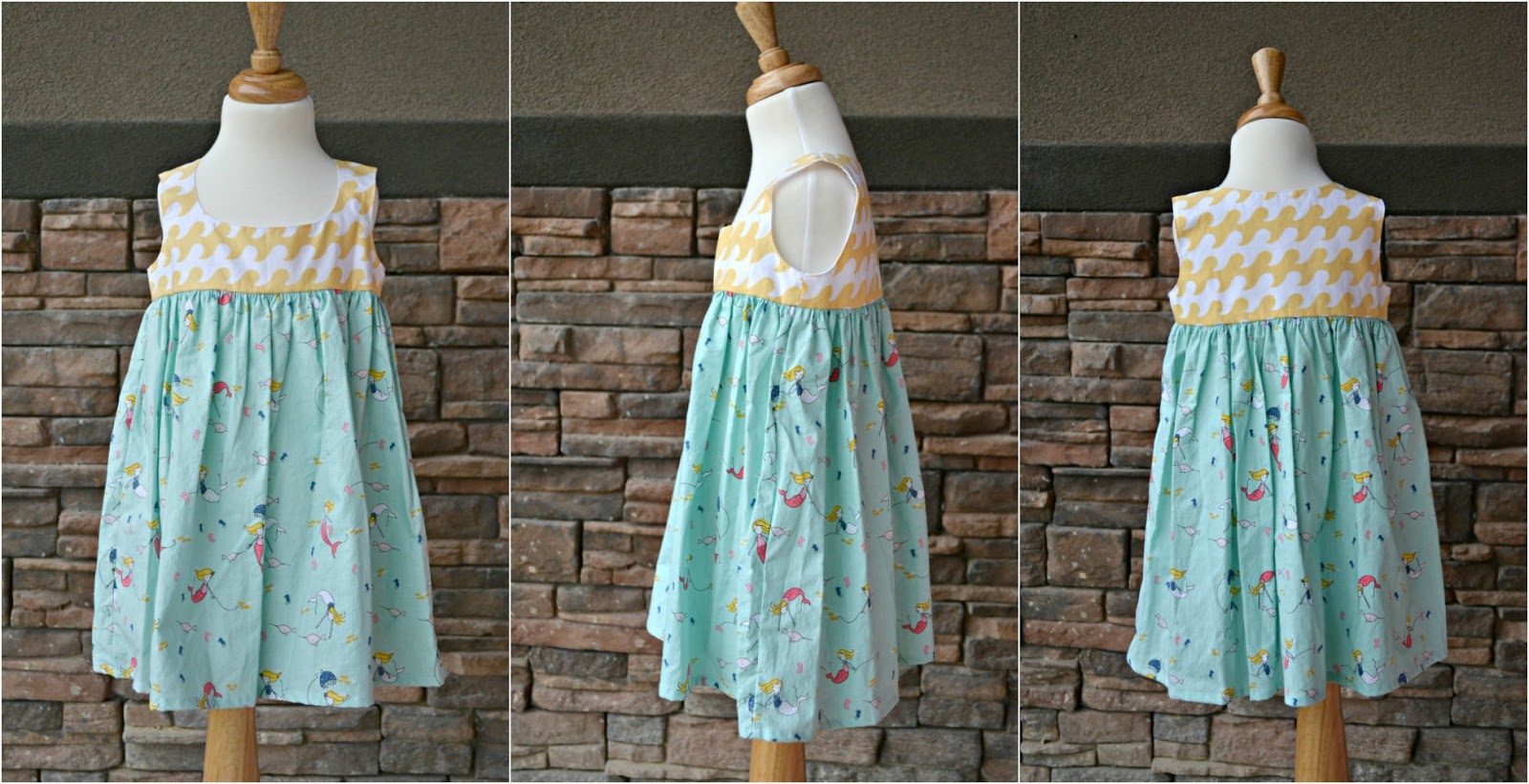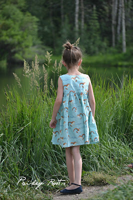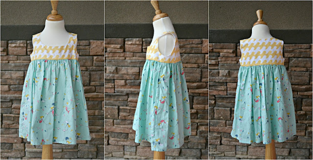 First up is a Mermaid dress in Riley Blake Fabrics, made in a size 4. I used the Desert Rose Dress pattern by Caila Made. There are no closures, zippers or buttons to deal with. This dress easily slips on and is great for kiddo's to dress themselves.
