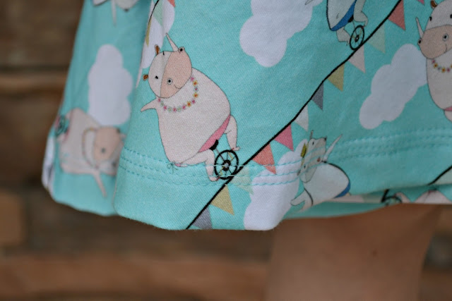 The fabric is Highwire Hippo's from Sash Fabrics. It was given to me by a friend and I was stoked when Paisley said she wanted a dress from it. Paisley loves the little hippo's and was giggling at the belly buttons. She's already named them too (Paisley & Takuya).