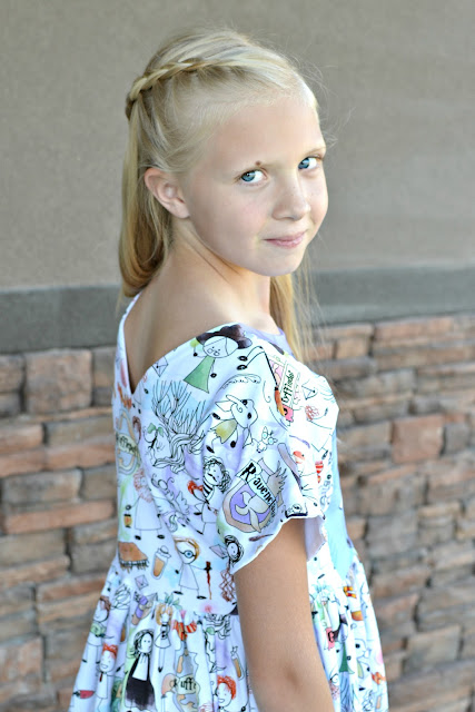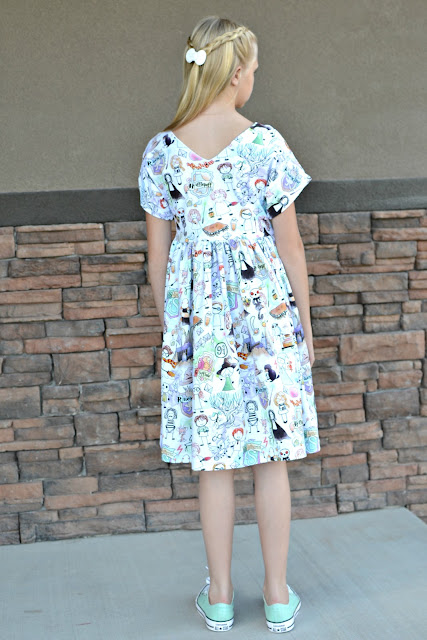 Since this panel only came in knit (I got the main print in Knit, Woven, and Pul) I chose to make the whole dress out of knit and just slightly hack the Pixie. Usually if I make a woven dress out of knit I will go down a size, but since this was a boxier style I chose to keep it at the size 12 and I'm trying not to freak on the fact that this girlie is THAT big already. So using knit was just a slight change.