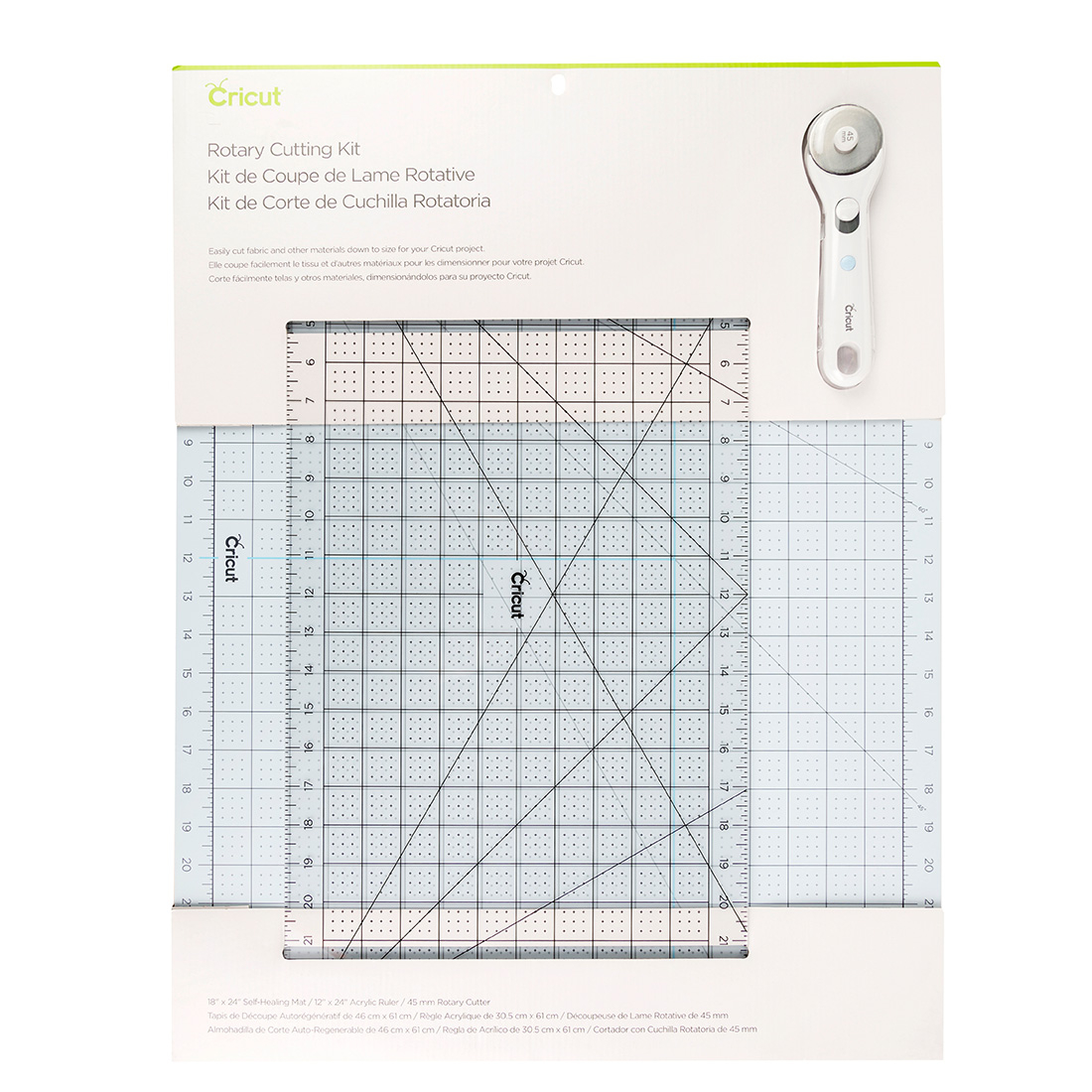This kit comes with an 18" by 24" double sided, self healing cutting mat, 12" by 24" Oversized Acrylic Ruler, and, of course, a 45mm Rotary Cutter.