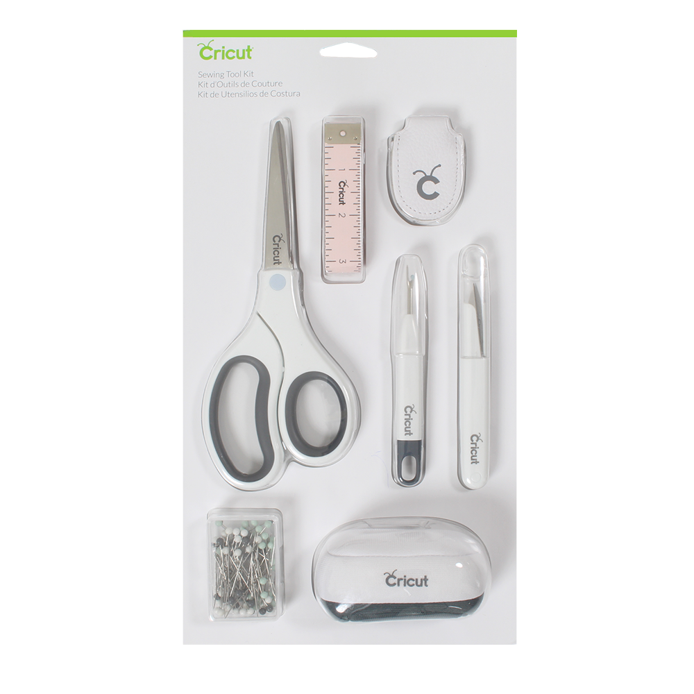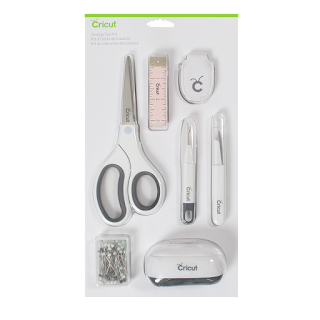 This comes with a pair of 8" Fabric Shears, Thread Snips, Seam ripper, Pin Cushion, Pins, Measuring Tape, and a Leather Thimble.