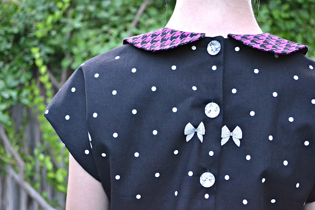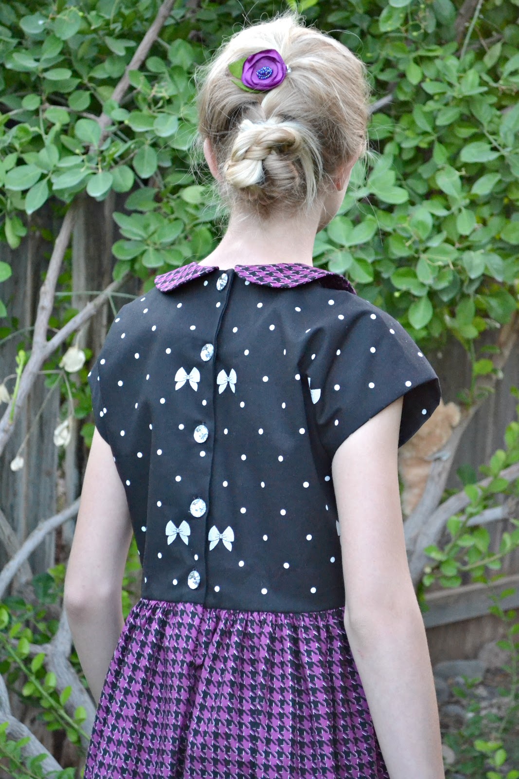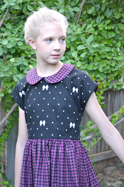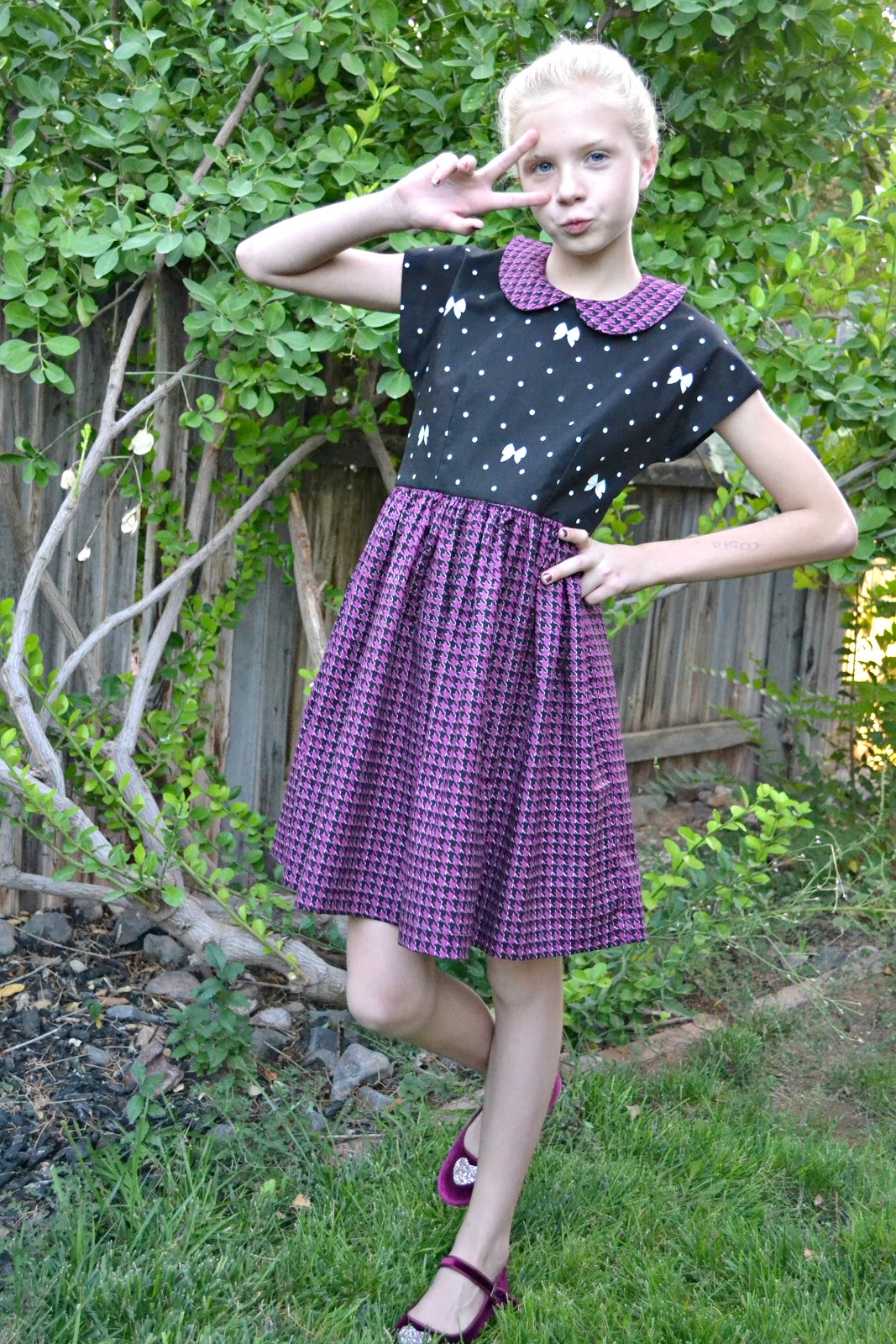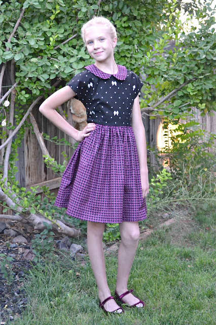 I know your thinking, "How on earth did this dress not have any of the stripes??" The Houndstooth Purple and Polka Bow Black was just calling to me to be a Holiday dress and I think it turned out just perfect!