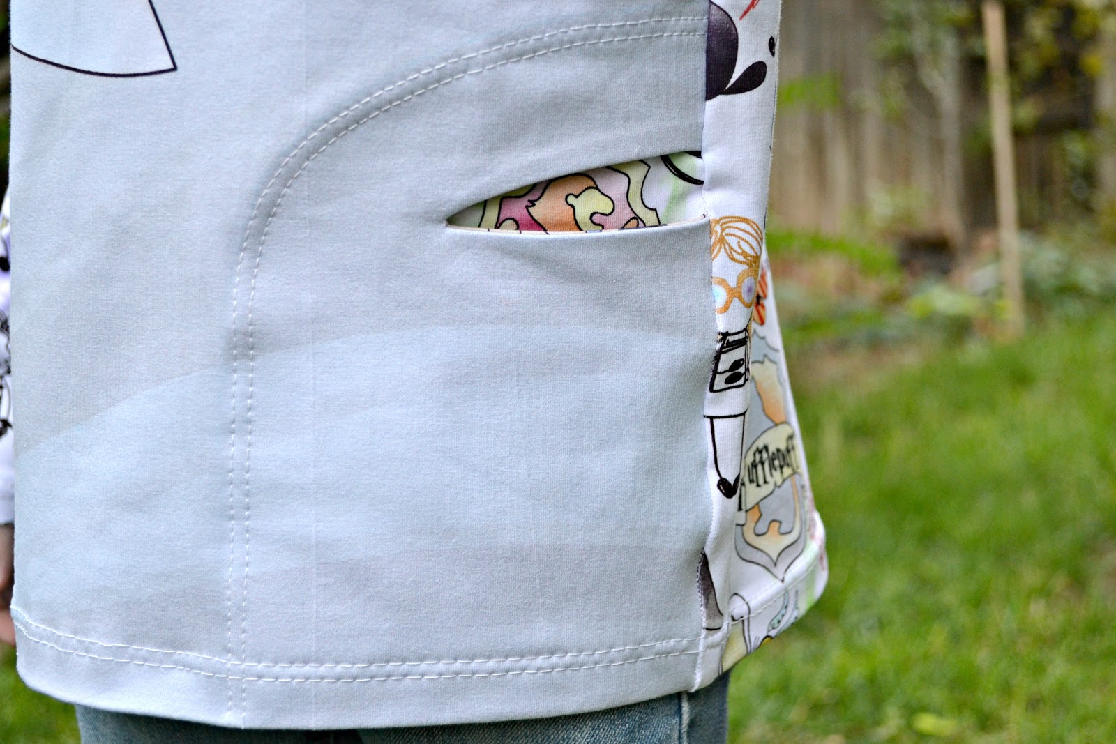 I used Titchy Threads Rowan Tee as my start and upsized so he could wear it over his shirts and then hacked the front to make for some side pockets.