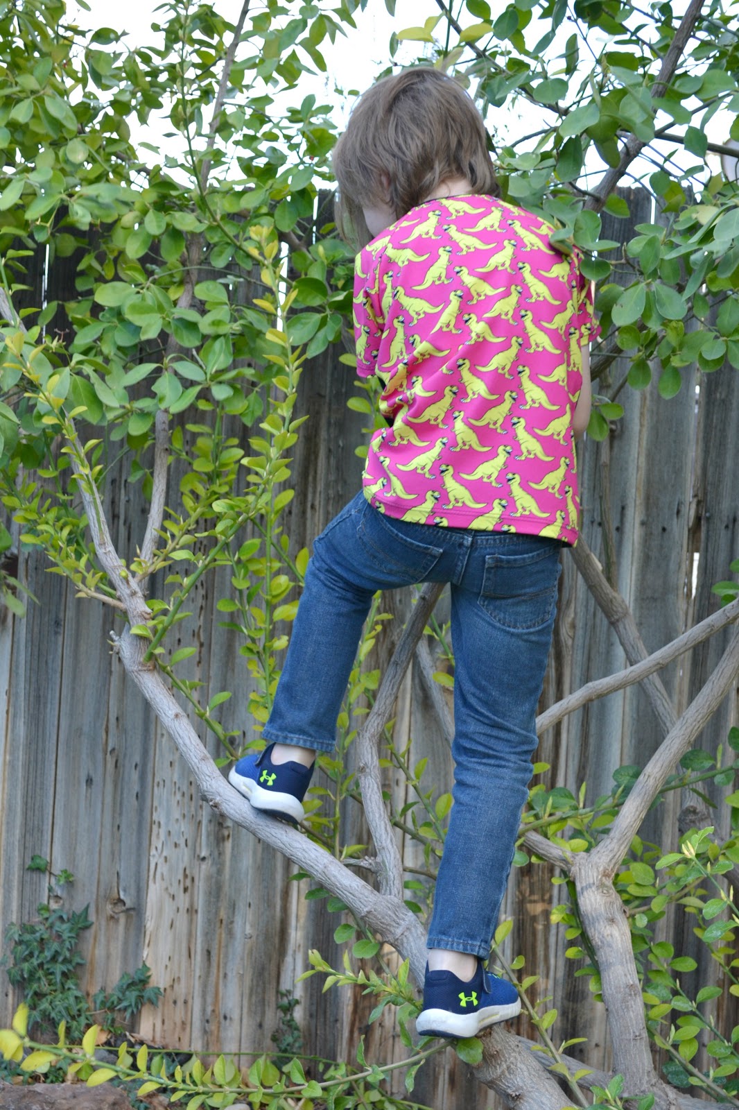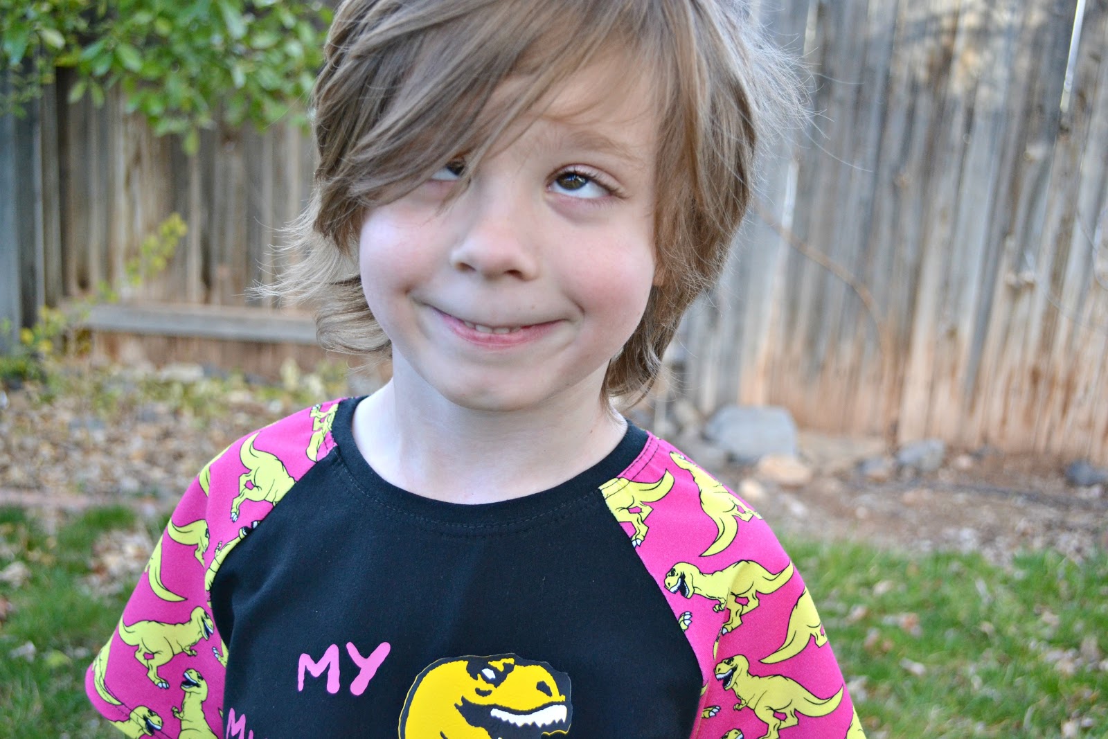 My motto with my kids has been, "if you like it, we can make it!" and Jude tends to have quite a lot of pink/purple/floral designs in his wardrobe. I've been holding onto this Dinosaur print from TKB Prints for a while now and it was one Jude chose for this series. He chose a few other prints, but due to life going crazy, it's the only one I got finished in time. LOL