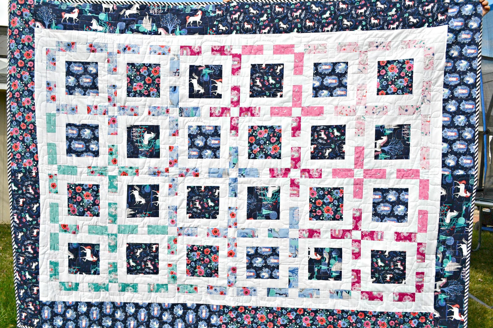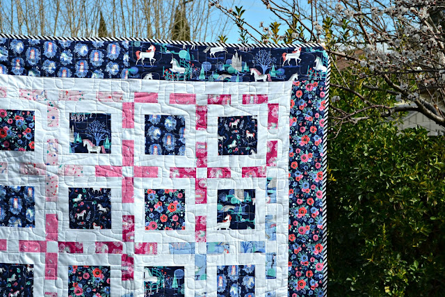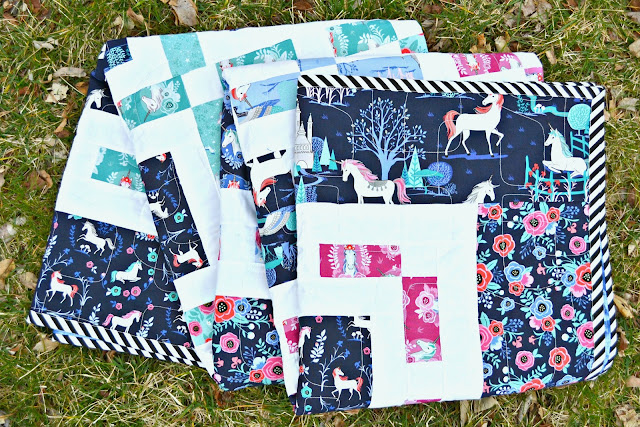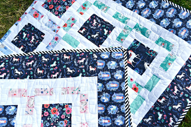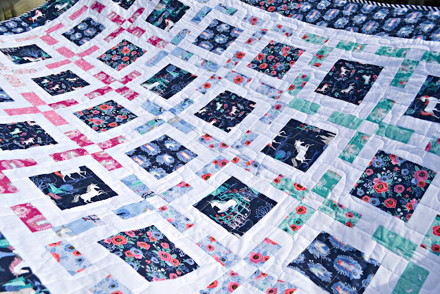I'm absolutely in love with this quilt, which I know I'm saying about every quilt I'm making, but seriously! Magical Unicorns and gorgeous florals and gradient rainbow??? All finished with STRIPES! What is there NOT to love?