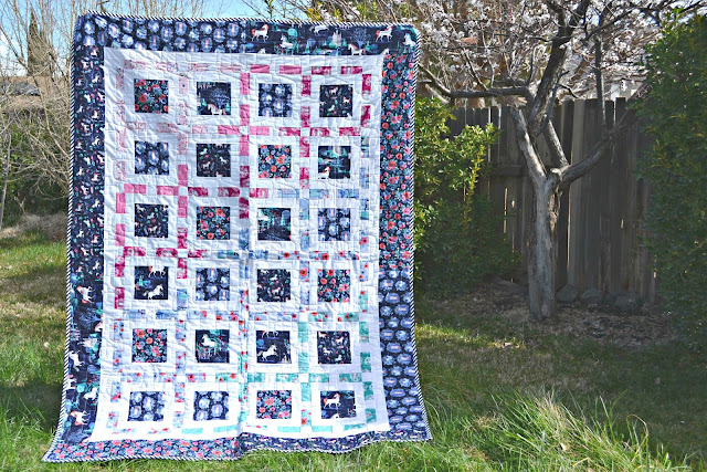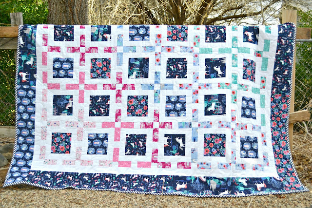 I knew my girls would just adore this line, so I had to make a quilt. I finally settled on Happy Squares Throw that is in Cricut Design Space. I'm telling you! That machine has been life changing to my quilting life! I did get a bit more fabric than required to make this into a twin size quilt rather than a throw. I then added the second border with all the navy prints around. The final quilt is 90" by 68".