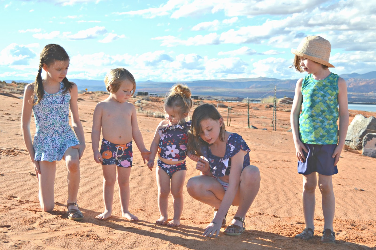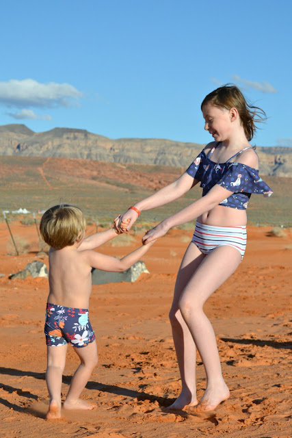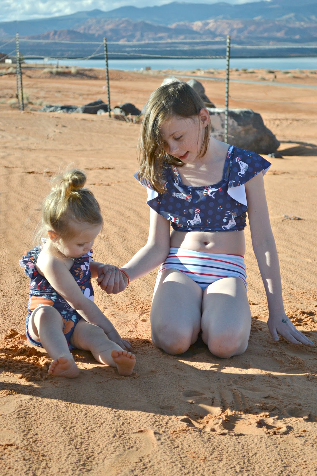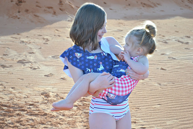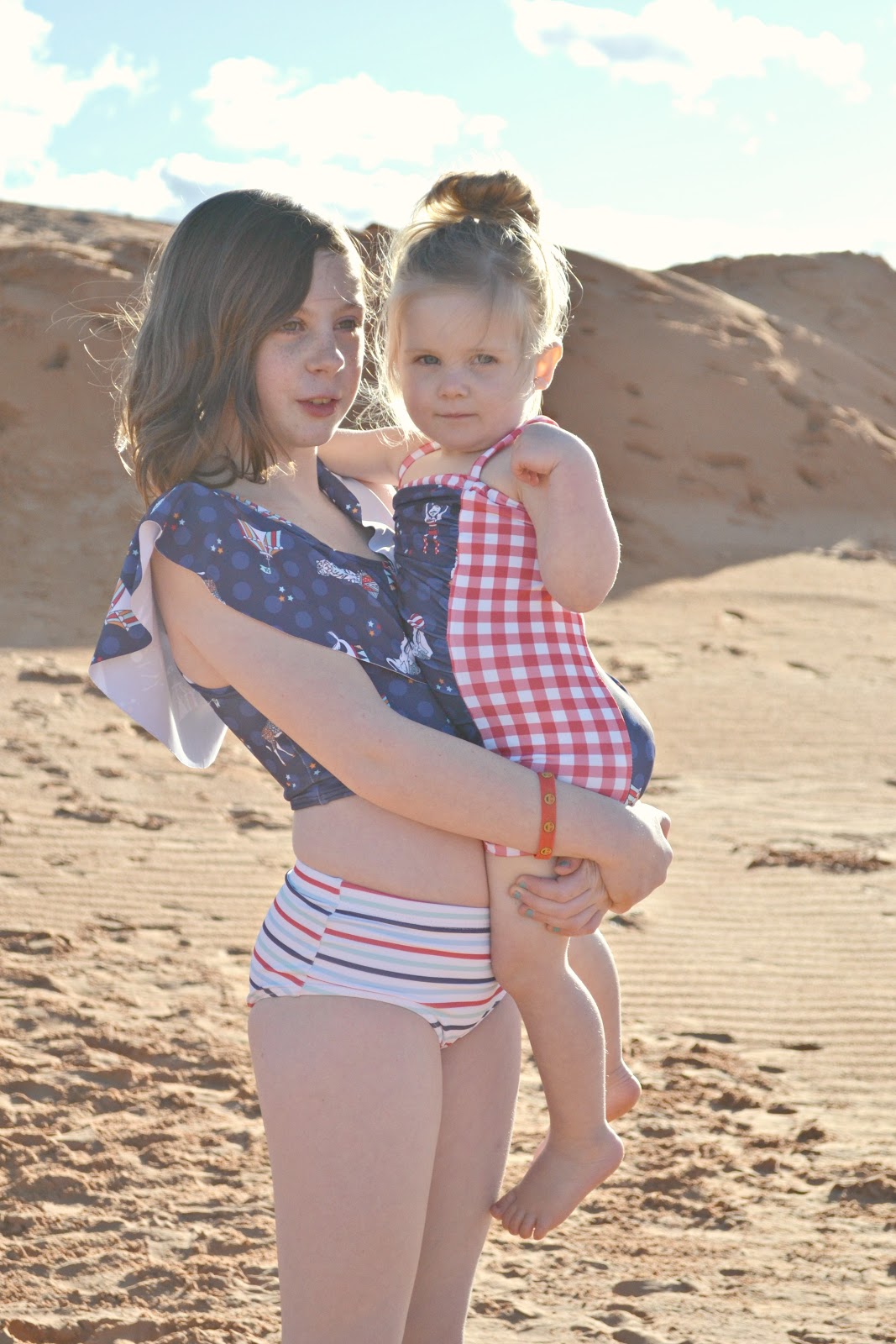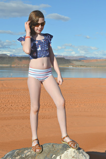 My girls have been all about the flounces this year and Zoe isn't the only one that will be sporting one this summer! Most of the time she kept the flounces on her shoulders, but there are straps on the suit so she can have them down on her upper arm.