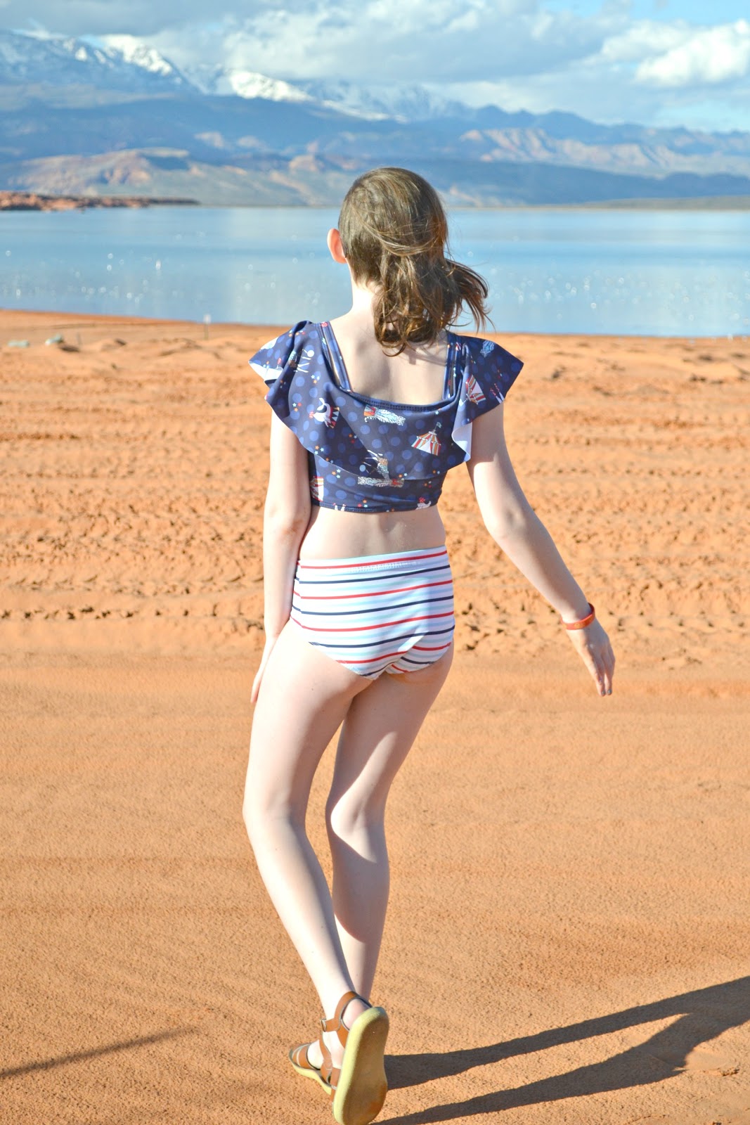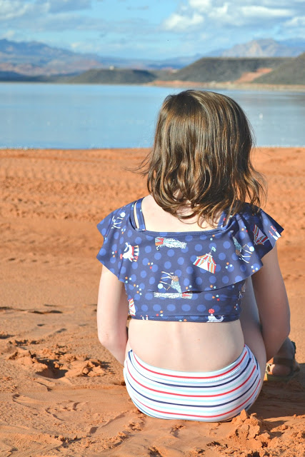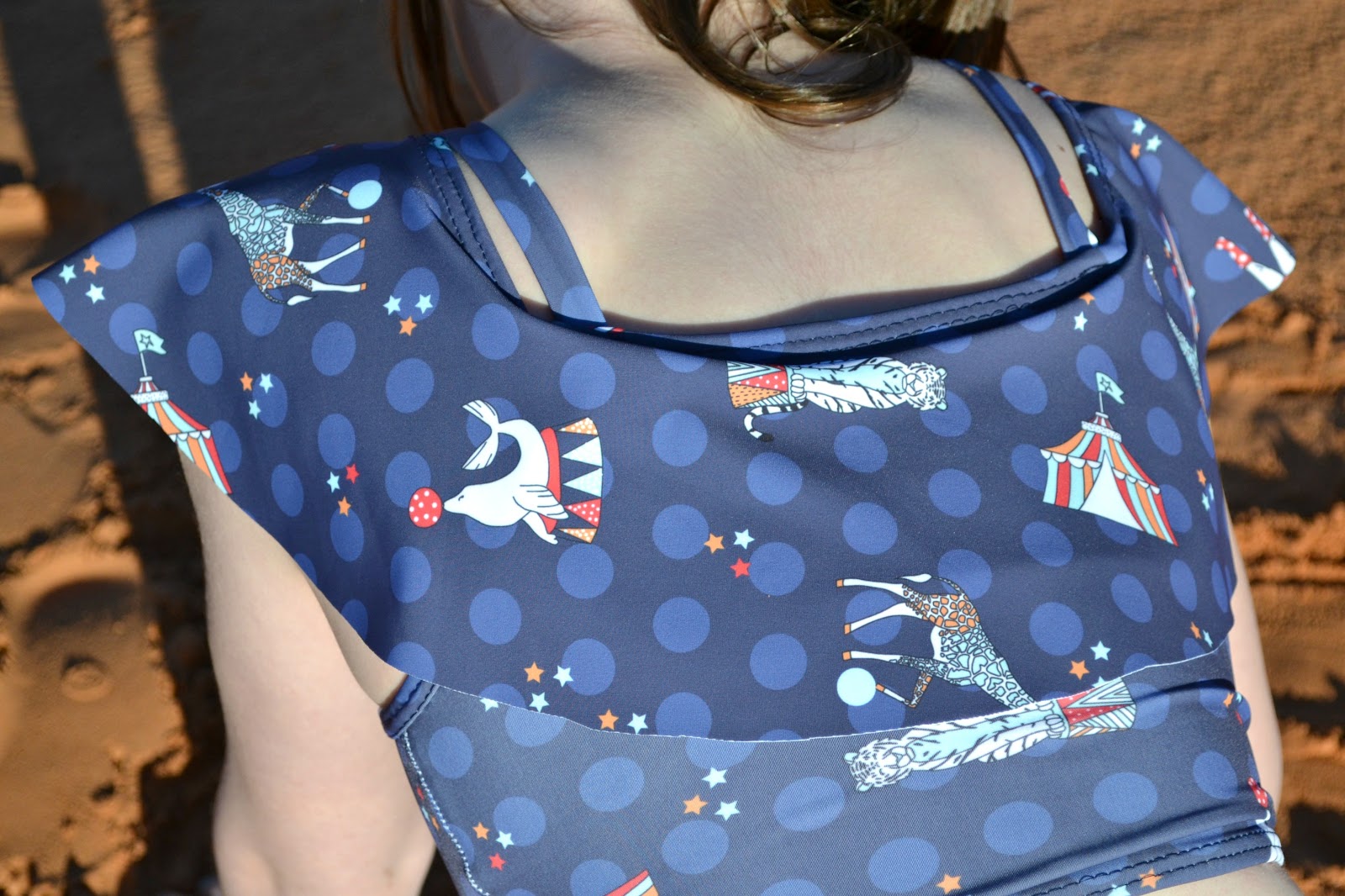 The suit I'm sharing today is the Boo Flounce Dress hacked into a swim top in Circus Animal in Blue paired with the Boo Swimmers Classic Briefs in Circus Multi Stripe.